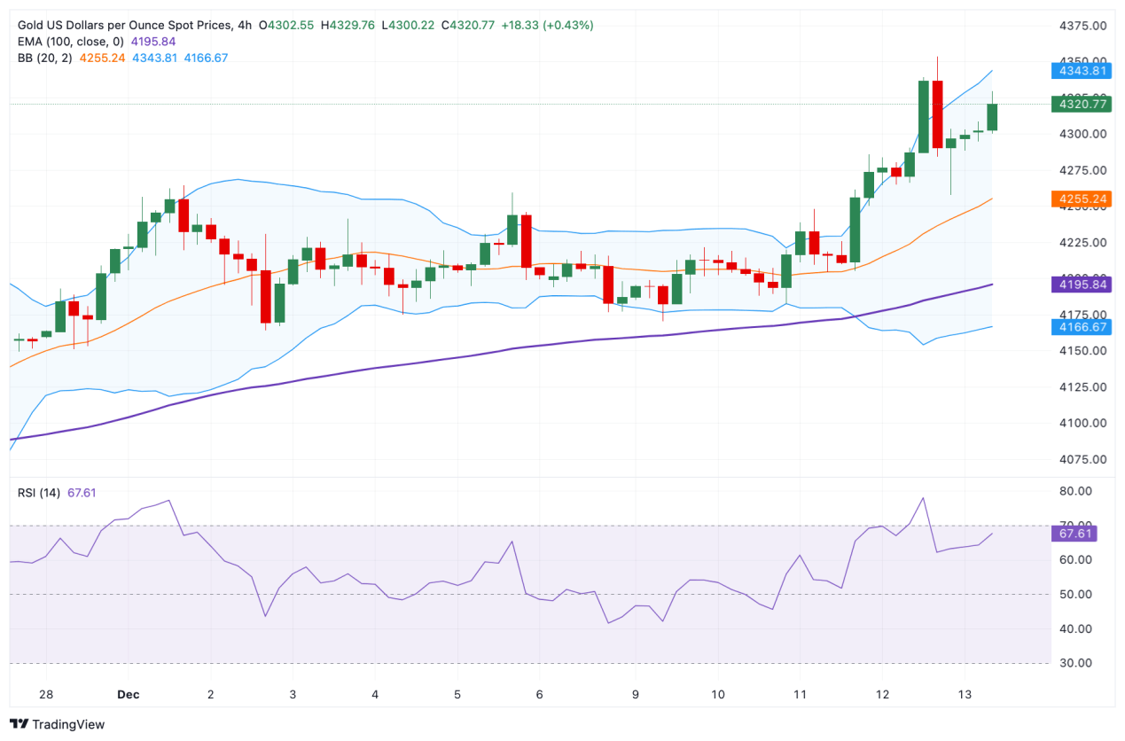 黄金价格(XAU/USD)在欧洲市场周一早盘交易时段持续上涨,触及4,325美元水平,创下近七周以来的高点。 不过,市场对美联储政策路径的预期仍存在变量。克利夫兰联储主席BethHammack近期指出,美联储应维持足够高的利率以持续压制通胀。芝加哥联储主席 AustanGoolsbee也提到,因前期政府停摆导致关键经济数据延迟发布,等待更多信息后再调整利率是更审慎的选择。 美联储理事斯蒂芬·米兰和纽约联储主席约翰·威廉姆斯周一的讲话,将为市场提供更多政策线索。 这一走势延续了近期贵金属市场的上行趋势,主要受到市场对美联储明年可能调整货币政策的预期影响。 黄金作为无息资产,其价格与市场利率水平存在直接关联。利率降低会减少投资者持有黄金的机会成本,从而提升这种贵金属的配置吸引力。 美联储上周宣布了2025年第三次也是最后一次降息,将利率下调25个基点至3.50%至3.75%的目标区间。美联储主席杰罗姆·鲍威尔表示,当前利率水平让央 行处于有利位置,未来将保持耐心观察经济形势。这一表态进一步强化了市场对宽松周期延续的判断。 若动能延续,金价可能冲击4381美元的历史高位及4400美元心理关口。下行方向,12月12日 ...