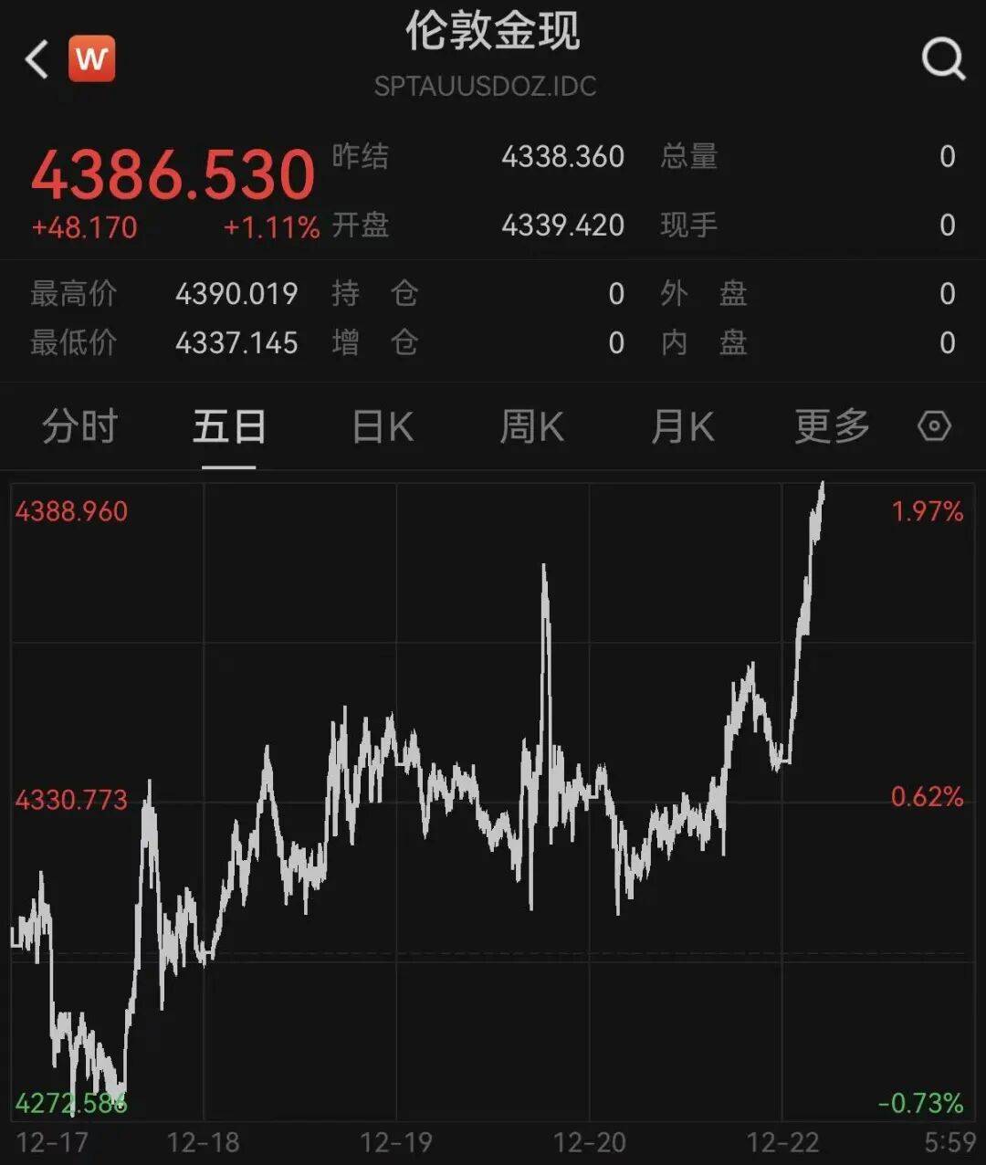 来源:北京时间 22日早间,现货黄金(伦敦金现)强势拉涨,盘中突破10月20日创下的历史纪录(4381.484美元),再 创新高。截至发稿,报4380.290美元/盎司,涨近1%。 对于年内金价强劲上涨,东吴证券首席经济学家芦哲此前表示,是多重引擎共振效应的结果。一是全球 央行延续2022年以来的购金趋势,这也是2022年以来黄金牛市最坚实的基础。二是地缘政治风险和代关 税政策带来较大不确定性。三是金融市场对美联储降息周期与债务问题的重定价。 此外,世界黄金协会12日报告显示,11月全球实物黄金ETF流入达52亿美元,已连续六个月实现流入。 截至11月底,资产管理总规模增至5300亿美元,环比增长5.4%;总持仓上升1%至3932吨,均创新高, 今年全球黄金ETF流入总量有望创下历史最佳年度表现。 芦哲表示,央行购金趋势未变、全球去美元化与地缘政治碎片化仍是长期过程、美国等主要经济体财政 与债务风险仍存等各种基础仍然稳固,对黄金的信用对冲需求继续存在且可能继续扩张,黄金牛市的核 心逻辑未被颠覆。 Wind数据显示,现货黄金价格年内涨幅超65%。 ...