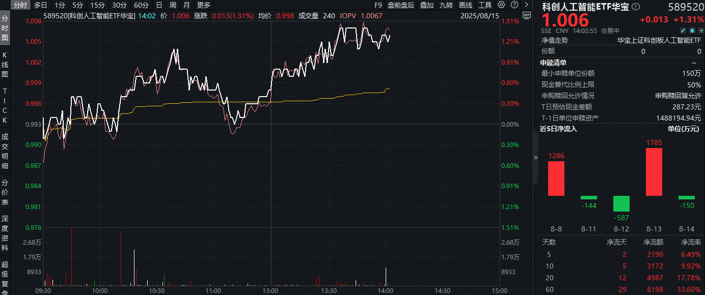 或由于资金看好国产替代+端侧AI发展两大逻辑,持续抢筹科创人工智能方向!上交所数据显示,科创 人工智能ETF华宝(589520)近60日累计吸金8198万元! 业内人士指出,2025年上半年AI眼镜市场的迅速发展,主要由三大核心因素共同推动:①AI大模型与 增强现实技术实现深度融合,带来AI眼镜更沉浸式的使用体验;②智能眼镜被纳入补贴范围后政策红 利持续释放,产品性价比显著提升,有效刺激消费需求;③头部厂商加速产品迭代,通过轻量化设计和 多元化功能拓展,使产品覆盖办公、医疗、娱乐等多场景应用需求。 中信证券表示,AI持续强劲,半导体周期处于上行通道,泛工业接棒消费电子也进入复苏阶段。AI仍 将是半导体产业向上成长的最大驱动力,一方面云端AI需求持续,另一方面终端AI应用有望加速落 地,并且中国半导体厂商在后续AI产业发展过程中的受益程度有望显著提升。 8月15日,重点布局国产AI产业链的科创人工智能ETF(589520)场内价格盘中涨逾1.4%,现涨1. 31%,实时成交额超2600万元,交投较为活跃!成份股方面,澜起科技涨超4%,道通科技、天准科 技、石头科技、芯海科技涨逾3%,合合信息、云从科技等个股跟涨 ...