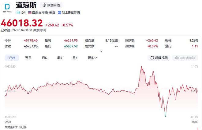 9月17日,在美联储宣布降息25个基点的同一天,美股三大指数收盘涨跌不一。 至收盘,道琼斯工业平均指数比前一交易日上涨260.42点,收于46018.32点,涨幅为0.57%。 标准普尔500种股票指数下跌6.41点,收于6600.35点,跌幅为0.1%。 纳斯达克综合指数下跌72.63点,收于22261.33点,跌幅为0.33%。 几大代表性科技股互有涨跌。英伟达跌超2%,特斯拉涨超1%,微软涨0.19%。 同时,当天美股市场热门中概股多数上涨,纳斯达克中国金龙指数收涨2.85%。百度涨超11%,蔚来涨 超6%,阿里巴巴、哔哩哔哩、理想汽车涨超2%。 消息方面,美联储主席鲍威尔发表讲话表示,今天的降息举措是一项风险管理决策,没有必要快速调整 利率。 欧洲股市方面,欧洲三大股指09月17日涨跌不一。英国伦敦股市《金融时报》100种股票平均价格指数 报收于9208.37点,较前一交易日上涨12.71点,涨幅为0.14%;法国巴黎股市CAC40指数报收于7786.98 点,较前一交易日下跌31.24点,跌幅为0.4%;德国法兰克福股市DAX指数报收于23359.18点,较前一 交易日上涨29.94点,涨幅为0.1 ...