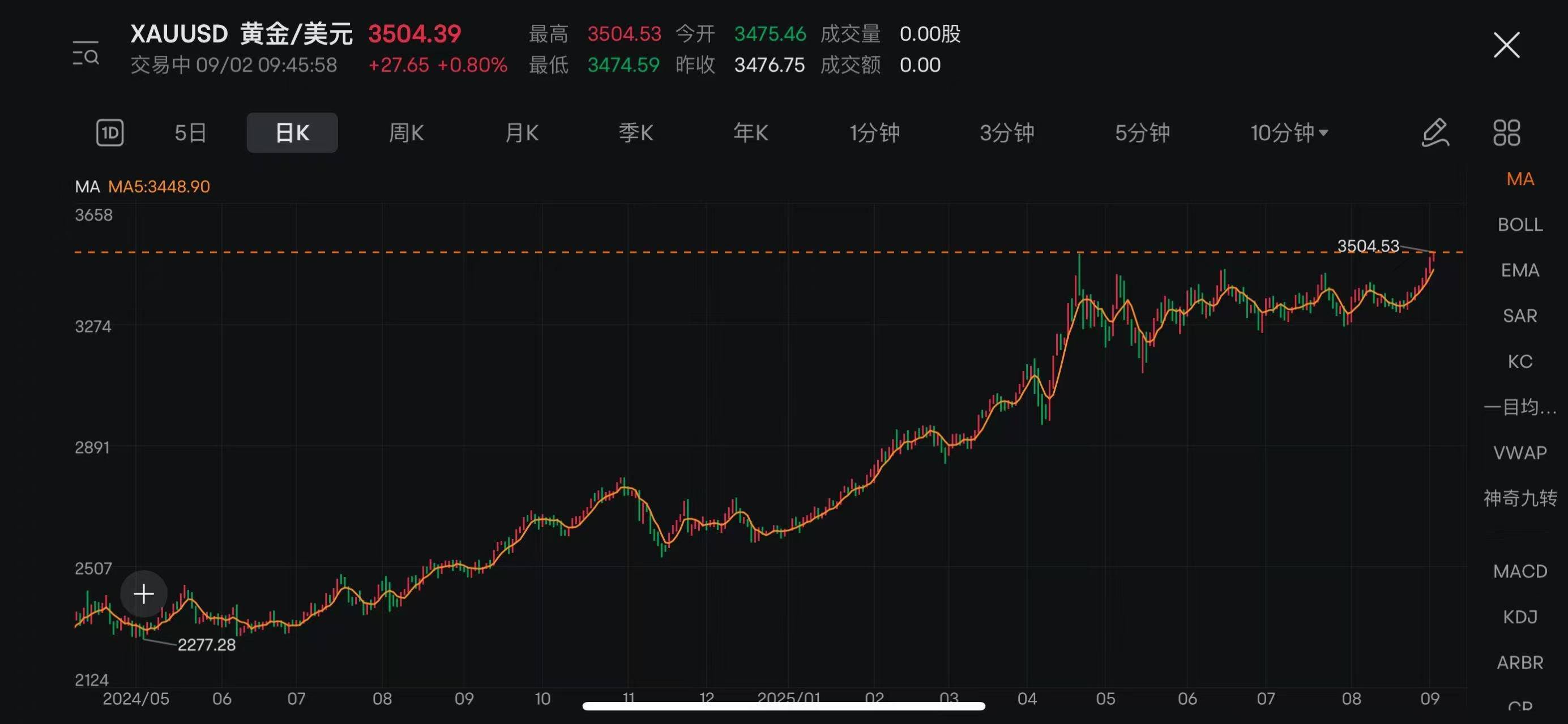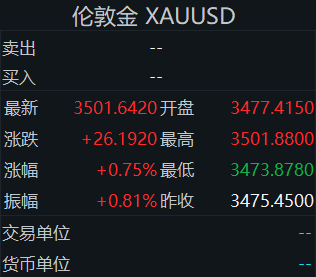 责编:李文玉 | 审核:李震 | 监审:古筝 【大河财立方消息】9月2日,现货黄金价格突破3500美元/盎司,创下历史新高,截至发稿报3501.64美 元/盎司。年初至今,金价累计涨幅超33%。 | | 伦敦金 XAUUSD | | | --- | --- | --- | | 奉田 | | | | 买入 | | | | 最新 | 3501.6420开盘 | 3477.4150 | | 涨跌 | +26.1920最高 | 3501.8800 | | 涨幅 | +0.75%最低 | 3473.8780 | | 振幅 | +0.81% 昨收 | 3475.4500 | | 交易单位 | | | | 货币单位 | | | ...