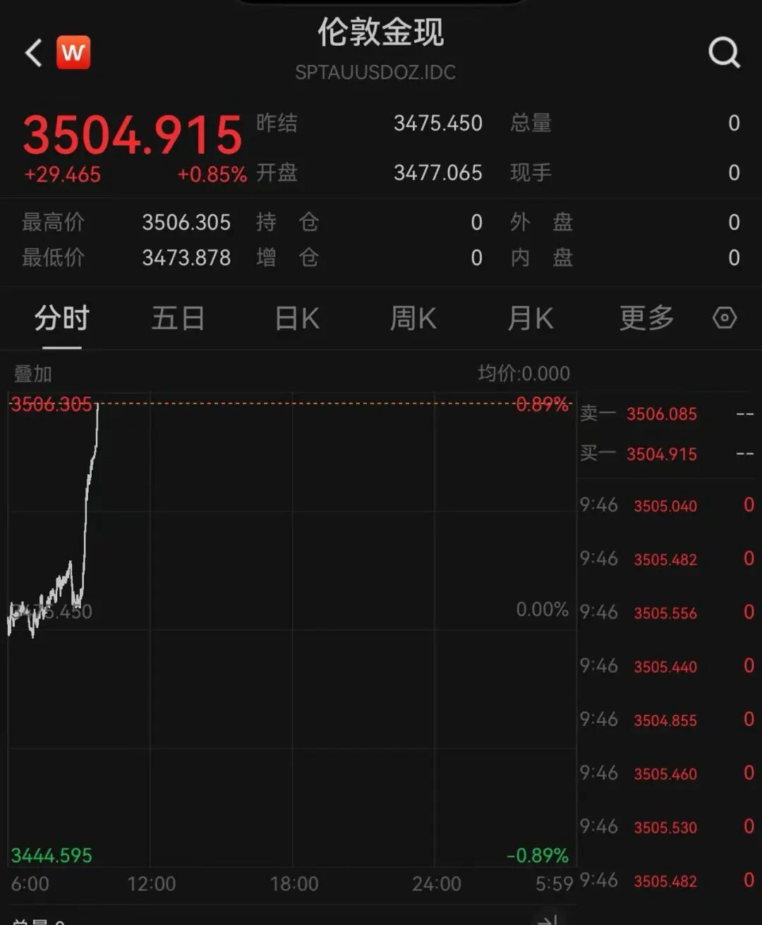 | < W | 伦敦金现 | | | | | | --- | --- | --- | --- | --- | --- | | | SPTAUUSDOZ.IDC | | | | | | 3504.915 ** | 总量 | | 3475.450 | | 0 | | +29.465 | +0.85% + 富 现 | | 3477.065 | | 0 | | 最高价 | 会 3506.305 持 器 | එ | O | | 0 | | 最低价 | 3473.878 불 内 물 | එ | 0 | | 0 | | 分时 | 月K モ日 | EK | 周K | 白菜 | | | 晉加 | 均价:0.000 | | | | | | 3506.3057 | | | | …-0.89% 卖一 3506.085 | | | | 21- | | | 3504.915 9:46 3505.040 | 0 | | | | | | 9:46 3505.482 | 0 | | I- 47 | | | | 0.00% 9:46 3505.556 | 0 | | | | | | 9:46 3505.440 | 0 | | | | | | 9 ...