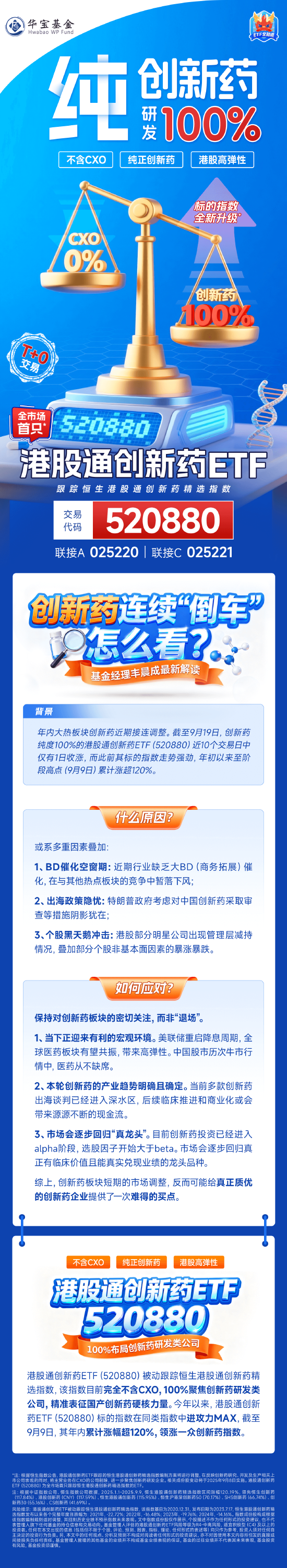 )华宝基金 45 御開 不含CXO 纯正创新药 港股高弹性 标的指数 全部门升级" @:(0 0 107 创新约 0 全市场 草豆* : Ra = Fill r 跟 踪 恒 生 港 股 通 创 新 药 精 选 指 数 交易 代码 呼拉人 095000 | 呼拉尔 025001 联技A UZƏZZU | 状技U UZOZZI 背景 年内大热板块创新药近期接连调整。截至9月19日. 创新药 纯度100%的港股通创新药ETF (520880) 近10个交易日中 仅有1日收涨,而此前其标的指数走势强劲,年初以来至阶 段高点 (9月9日) 累计涨超120%。 什么用因? 或系多重因素叠加: 1、BD催化空窗期: 近期行业缺乏大BD(商务拓展) 催 化,在与其他热点板块的竞争中暂落下风; 女D 中国 | 2017 | 2 保持对创新药板块的密切关注,而非"退场"。 1、当下正迎来有利的宏观环境。美联储重启降息周期,全 球医药板块有望共振,带来高弹性。中国股市历次牛市行 情中, 医药从不缺席。 2、本轮创新药的产业趋势明确且确定。当前多款创新药 出海谈判已经进入深水区,后续临床推进和商业化或会 2、出海政策隐忧:特朗普政府 ...