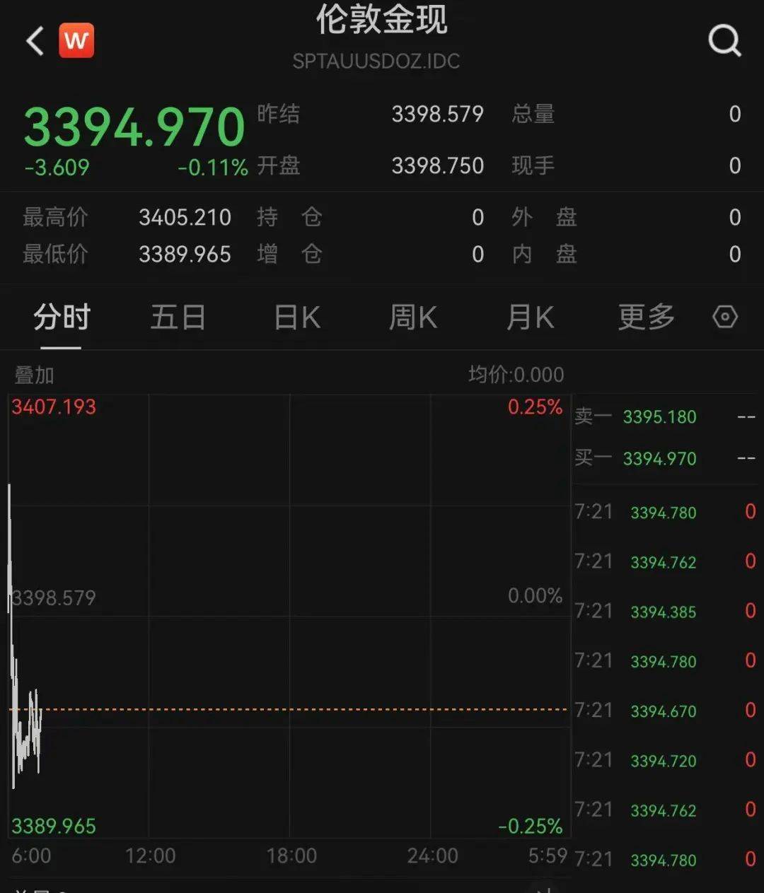 今日早间,现货黄金、比特币集体低开,其中,COMEX黄金跌近1%。消息面上,美财长表示,正牵头物色鲍威尔的继任人选,特朗普也有最新消息。 | < W | 伦敦金现 | | | | | Q | | --- | --- | --- | --- | --- | --- | --- | | | SPTAUUSDOZ.IDC | | | | | | | 3394.970 " | | | 3398.579 | 原 | | 0 | | -3.609 | -0.11% -- | | 3398.750 | 现手 | | 0 | | 最高价 | 3405.210 | 持 仓 | 0 | 9 2 | | 0 | | 最低价 | 3389.965 | 增 仓 | 0 | 内 雷 | | 0 | | 4784 | 五昌 | EK | 周K | 月K | 明多 | (0) | | 叠加 | | | | 均价:0.000 | | | | 3407.193 | | | | 0.25% | 卖一 3395.180 | | | | | | | | 3394.970 | | | | | | | 7:21 | 3394.780 | 0 | | | ...