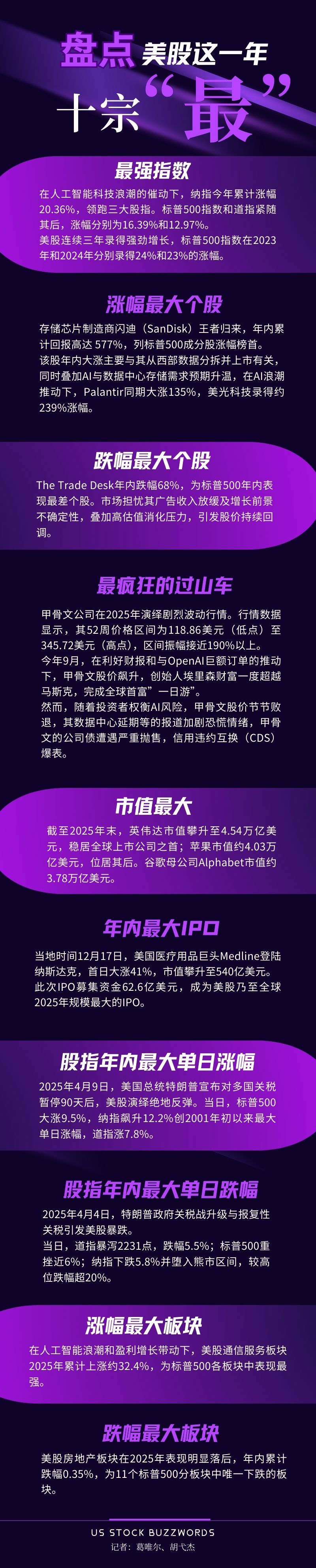 个股表现 - The Trade Desk为2025年标普500指数中表现最差的个股,年内股价跌幅达68%,市场担忧其广告收入放缓、增长前景不确定性以及高估值消化压力[3] - 甲骨文公司在2025年股价波动剧烈,其52周价格区间为118.86美元至345.72美元,区间振幅接近190%以上,9月因利好财报和与OpenAI的巨额订单推动股价飙升,随后因投资者权衡AI风险及数据中心延期等报道引发股价回调与公司债抛售[4] 市值排名 - 截至2025年末,英伟达市值攀升至4.54万亿美元,位居全球上市公司之首[6] - 苹果市值约为4.03万亿美元,位居第二[6] - 谷歌母公司Alphabet市值约为3.78万亿美元,位居第三[6] 首次公开募股 - 美国医疗用品巨头Medline于2025年12月17日登陆纳斯达克,首日股价大涨41%,市值攀升至540亿美元[8] - 此次IPO募集资金62.6亿美元,成为美股及全球2025年规模最大的IPO[8] 股指波动 - 2025年4月9日,在宣布对多国关税暂停90天后,美股大幅反弹,标普500指数大涨9.5%,纳斯达克指数飙升12.2%创2001年初以来最大单日涨幅,道琼斯工业平均指数上涨7.8%[9] - 2025年4月4日,因关税战升级与报复性关税,美股暴跌,道琼斯工业平均指数暴泻2231点跌幅5.5%,标普500指数重挫近6%,纳斯达克指数下跌5.8%并堕入熊市区间较高位跌幅超20%[10] 板块表现 - 在人工智能浪潮和盈利增长带动下,美股通信服务板块2025年累计上涨约32.4%,为标普500各板块中表现最佳[11] - 美股房地产板块在2025年表现落后,年内累计跌幅0.35%,为11个标普500分板块中唯一下跌的板块[13]