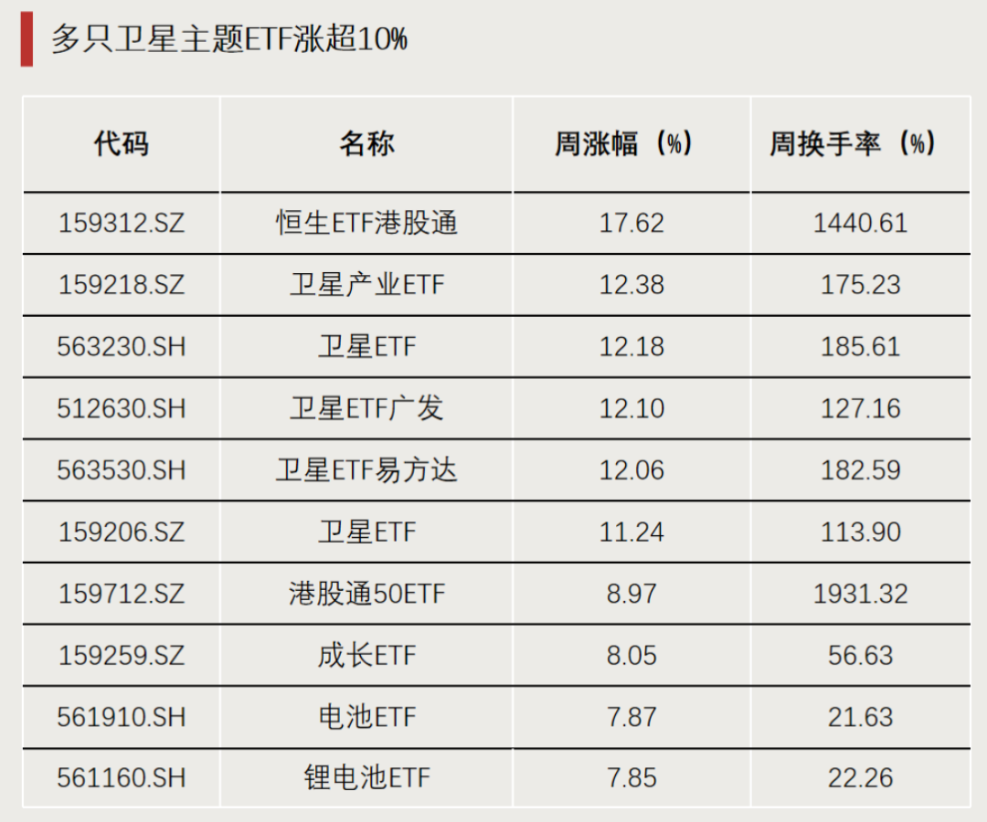 01 上周商业航天板块领涨,卫星ETF易方达(563530)跟踪的中证卫星产业指数涨超12%。 02 上周大盘宽基产品成交活跃,其中A500ETF易方达(159361)等跟踪中证A500指数的ETF合计成交额超3000亿元。 03 上周全市场ETF获915亿元资金净流入,A500ETF易方达(159361)等跟踪中证A500指数的ETF合计净流入额近500亿元,成为上周ETF市场"吸金"主力。 04 在资金大幅涌入的背景下,截至12月26日,全市场ETF规模突破6万亿元,"百亿ETF俱乐部"扩容至125只。 | 代码 | 名称 | 周涨幅 (%) | 周换手率(%) | | --- | --- | --- | --- | | 513780.SH | 港股创新药50ETF | -2.38 | 24.04 | | 159506.SZ | 港股通医疗ETF富国 | -2.37 | 25.77 | | 520510.SH | 港股通医疗ETF | -2.33 | 68.44 | | 520970.SH | 港股通创新药ETF嘉实 | -2.27 | 13.98 | | 520700.SH | 港股创新药ETF基金 | ...