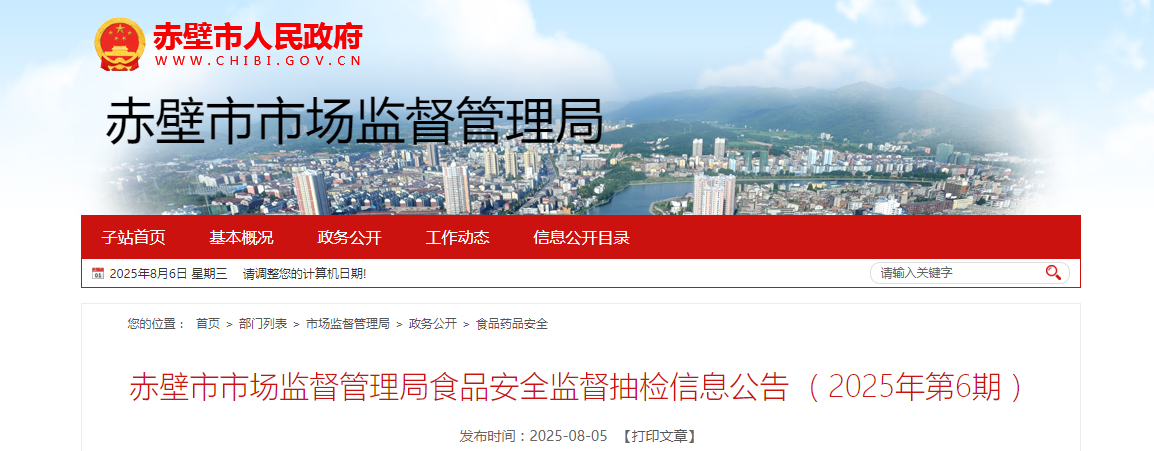 湖北省赤壁市市场监督管理局食品安全监督抽检信息公告 (2025年第6期)