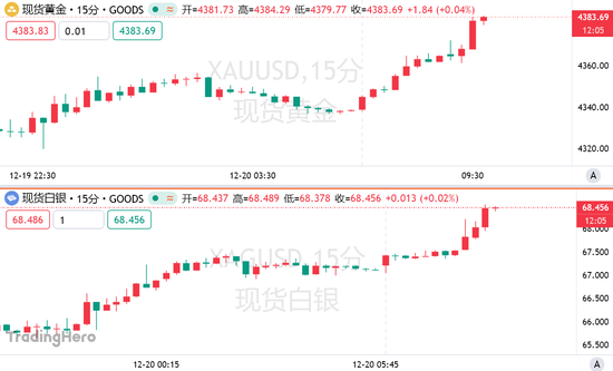 贵金属价格表现 - 周一现货黄金价格冲上4380美元上方,再度刷新历史新高 [1][6] - 周一现货白银一度涨超2%,将历史新高刷新至68美元上方 [1][6] - 贵金属市场正结束具有历史意义的一年,黄金和白银都将创下1979年以来最大的年度涨幅 [3][8] - 白银价格已翻倍有余,黄金价格也飙升了约三分之二 [3][8] 驱动价格上涨的核心因素 - 市场对美联储明年将进一步降息的预期是推动价格上涨的因素之一 [1][6] - 地缘政治紧张局势恶化增强了贵金属的避险吸引力 [1][3][6][8] - 对于不支付利息的黄金和白银来说,宽松的货币政策是一大利好 [3][8] - 各国央行购买量的增加以及黄金ETF的资金流入是推动价格上涨的主要动力 [3][8] 市场供需与资金流向 - 黄金ETF已连续五周出现资金流入 [3][8] - 世界黄金协会数据显示,今年除了5月,黄金ETF的总持仓量每个月都在增长 [3][8] - 白银在最近几周受到需求激增以及主要交易中心供应紧张和错位的提振 [3][8] - ETF投资者已开始与各国央行争夺有限的黄金供应 [4][9] 机构观点与价格展望 - 高盛分析师预计明年黄金将进一步上涨,设定了每盎司4900美元的基本情景,且存在上行风险 [4][9]