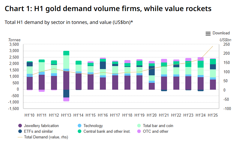全球黄金需求趋势 - 2025年二季度全球黄金需求总量(包含场外交易)达到1249吨 同比增长3% 主要受黄金投资需求推动 [1] - 黄金ETF投资成为关键驱动力 二季度流入量达170吨 与2024年同期的少量流出形成对比 [1] - 亚洲地区黄金ETF持仓增加70吨 北美地区净流入73吨 两者几乎持平 [1] - 上半年全球黄金ETF需求总量达397吨 创2020年以来上半年最高纪录 [1] 金条与金币投资 - 二季度全球金条与金币投资总量同比增长11%至307吨 [1] - 中国投资者需求同比激增44%至115吨 领跑全球市场 [1] - 印度投资者需求达46吨 欧洲地区净投资增长逾一倍至28吨 美国需求降至9吨 [1] 央行购金动态 - 二季度全球央行增储166吨 购金节奏有所放缓但仍处高位 [2] - 95%受访央行预计未来12个月全球央行黄金储备将进一步增加 [2] 金饰消费市场 - 二季度全球金饰消费量同比下降14% 逼近2020年疫情期间低谷 [2] - 中国与印度金饰需求分别下滑20%与17% 但以价值计算的消费金额上涨至360亿美元 [2] 金价表现与市场展望 - 上半年美元金价涨幅达26% 跑赢多数主流资产类别 [3] - 宏观经济环境高度不明朗 可能为黄金提供进一步支撑 [3] - 若经济或地缘政治局势恶化 黄金避险吸引力可能放大并推动金价走高 [3]