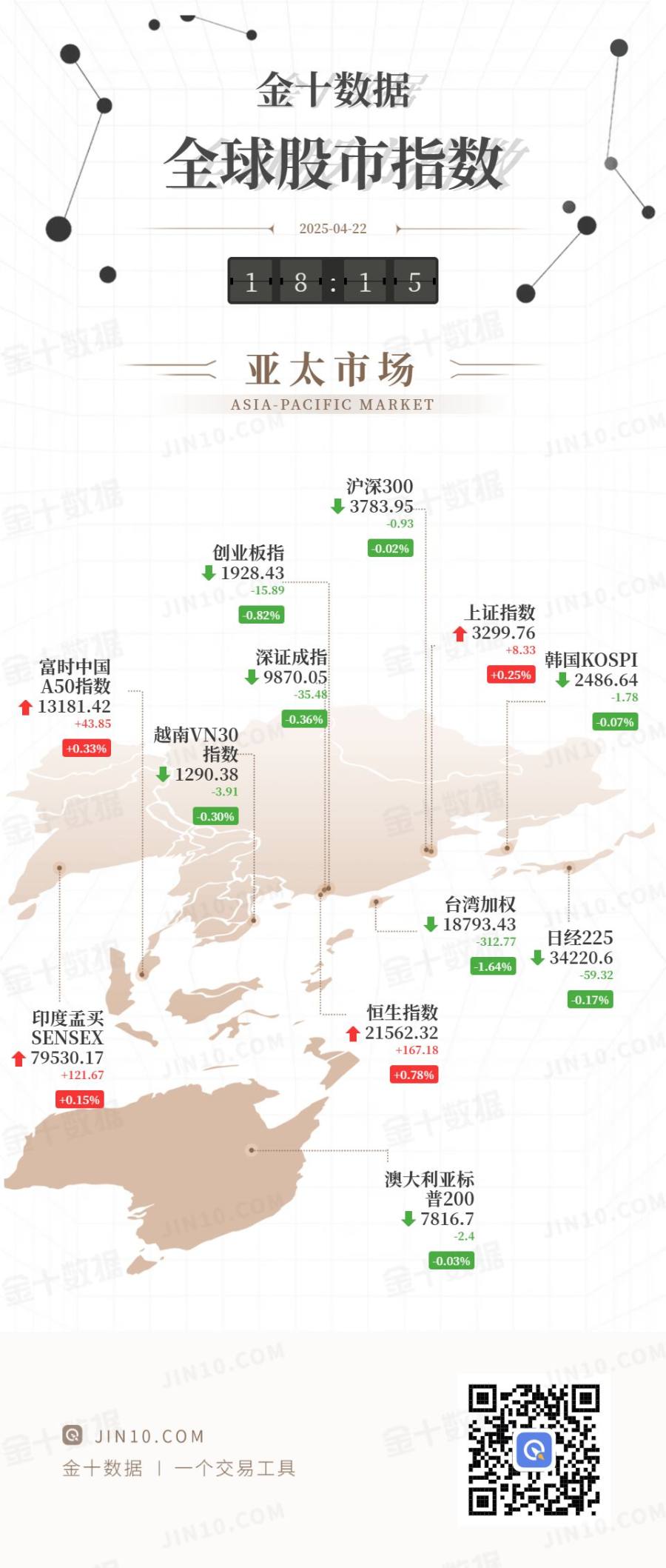 金十图示:2025年04月22日(周二)全球股市指数-亚太市场(收盘)