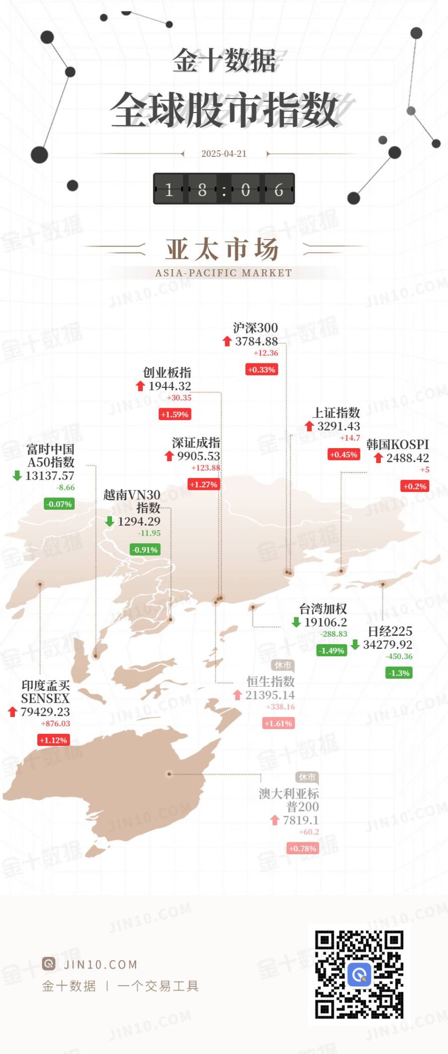 34279.92 -1.49% -450.36 休市 -1.3% 恒生指数 印度孟买 ↑ 21395.14 SENSEX +338.16 ↑ 79429.23 +1.6196 +876.03 +1.12% 休市 澳大利亚标 普200 7819.1 +60.2 +0.78% @ JIN10.COM 金十数据 | 一个交易工具 金十图示:2025年04月21日(周一)全球股市指数-亚太市场(收盘) ...