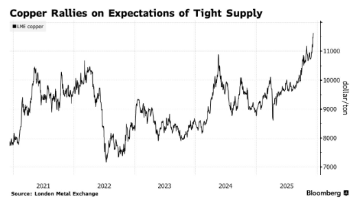 核心观点 - 在全球供应趋紧、中国政策支持及美国库存囤积等多重因素推动下,铜价攀升至历史新高,市场持续看好其涨势 [1][3] 价格表现与市场动态 - 伦敦金属交易所(LME)铜价周一大幅上涨约1%,突破前一交易日每吨11705美元的纪录,盘中一度触及每吨11771美元的高点 [1][3] - 截至发稿,LME铜价上涨约0.4%,报每吨11711.5美元 [3] - 铜价今年在LME已累计上涨逾30% [3] - 其他金属价格普遍走高,锌价上涨0.7%,铝价上涨0.4% [3] 驱动因素:宏观经济与政策 - 中国高层明确表示将继续保持“适度宽松”的货币政策,并采取更加积极的财政举措,提振了市场信心 [1] - 中国上月出口反弹超出预期,推动中国年度贸易顺差首次突破1万亿美元,为铜价提供了支撑 [1] 驱动因素:供需基本面 - 花旗分析师发布看涨观点,进一步助推了本就因供需失衡及全球原材料短缺而火热的行情 [3] - 市场担忧明年美国进口关税实施前铜将大量流向美国,导致其他主要地区库存紧张、现货溢价攀升,加速了近期铜价涨势 [3] - 中信证券分析师指出,2026年全球精炼铜供应可能出现45万吨的缺口,部分原因正是美国的囤货行为 [3] - 中信分析师团队强调,明年铜价需平均维持在每吨12000美元以上,才能吸引新矿产投资,保障中长期供应充足 [3]