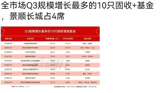 来源:城商行研究 昨天大家都被景顺长城的朋友们刷屏了: | | | Q3规模增长最多的10只固收增强基金 | | | | --- | --- | --- | --- | --- | | 吸用代引 | 日前景区 | 服務費加值(亿) | 今年以東國權 | 基金科理 | | 014068 OF | 康直维修道灵使用A | 273.31 | 15.21% | 民植,来宣传 | | 003504 OF | 图图机试图机电视语A | 222 25 | 24,21% | 团组,学验文,江山 | | 014000 DF | 中欧和利侵格A | 184.67 | 7.44% | :绿原城 | | 276571 OF | 直营动同信用A | 20001 | 1.5577 | 复典班: 黄胶兔 | | 018756.0F | 都齿着盘露30天精有世界A | 156.12 | 7.33% | 应值新 | | 016869 OF | 影音长城是香港日便器人 | 166-15 | 636% | 图书馆 | | 100035 OF | 重要代化营销售额A/B | 148.49 | 18.01% | 好用服 | | DOGBS.OF | ...