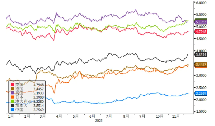 全球层面,各国财政可持续性疑虑和通胀压力令市场押注2026年多国将重启加息。日本30年期国债收益 率自11月以来上涨34个基点至3.39%,领跑全球长债抛售潮。 降息预期伴随鹰派转向 美联储两天政策会议将于周三下午结束并公布决议,尽管市场高度确信本周将降息25个基点至 3.5%-3.75%区间,但投资者更关注官员通过点阵图释放的2026年政策路径信号。 全球长债遭遇新一轮抛售潮,美国10年期国债收益率周二升至4.17%,30年期收益率逼近4.82%,均创9 月以来新高。与此同时,日本、澳大利亚、加拿大等国长债收益率自11月以来大幅攀升,投资者要求的 风险溢价显著上升。 周二,市场焦点转向本周美联储利率决议,交易员预计周三降息25个基点的概率约为90%,但分析师认 为决议将伴随鹰派基调,暗示明年可能延长暂停降息。掉期市场显示的终端利率已从不到3%跳升至 3.2%,为7月以来最高水平。 政策不确定性推动长期收益率上行。纽约联储的期限溢价模型显示该指标已回升至约0.7%,与9月初水 平相当。特朗普即将提名接替明年任期届满的主席鲍威尔的人选,市场对美联储可能低估通胀风险的担 忧升温。 财政部调整了本周拍卖时间表以配合 ...