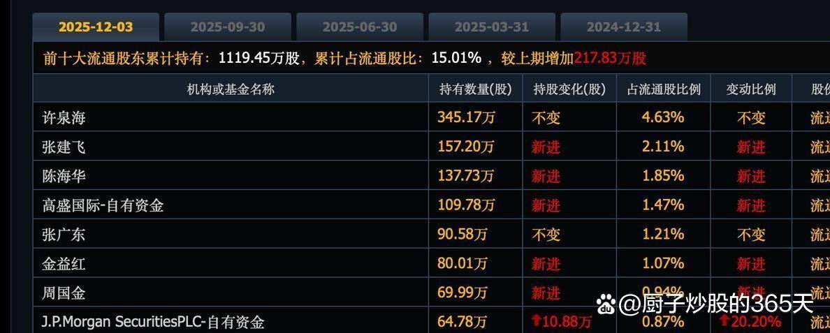 市场沸腾之际,投资者发现高盛、摩根士丹利、瑞银等外资巨头早已潜伏其中——今年三季度,这些机构精准布局了7只无人驾驶概念股,今日3只涨停的股 票均在其列。 2025年12月19日,A股无人驾驶板块掀起涨停潮。 雷尔伟暴涨12.97%,万隆科技拉升11.82%,浙江世宝封死10%涨停板。 | 2025-12-03 | | | 2024-12-31 | | | --- | --- | --- | --- | --- | | 前十大流通股东累计持有:1119.45万股,累计占流通股比:15.01%,较上期增加217.83万股 | | | | | | 机构或基金名称 | 持有数量(股) | 持股变化(股) | 占流通股比例 | 变动比 | | 许泉海 | 345.17万 | 不变 | 4.63% | 不变 | | 张建飞 | 157.20万 | 新进 | 2.11% | 新进 | | 陈海华 | 137.73万 | 新进 | 1.85% | 新进 | | 高盛国际-自有资金 | 109.78万 | 新进 | 1.47% | 新讲 | | 张广东 | 90.58万 | 不变 | 1.21% | 不要 | | 金益红 | ...