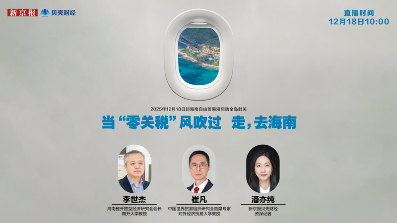 见证历史时刻!12月18日海南全岛正式"封关"。海南封关到底是什么?对普通人的生活有哪些影响?未来又有哪 些新机遇?新京报贝壳财经第一时间连线海南省开放型经济研究会会长、南开大学教授李世杰,中国世界贸易组 织研究会首席专家、对外经济贸易大学教授崔凡拆解关键问题。 预告时间:2025-12-1810:00 ...