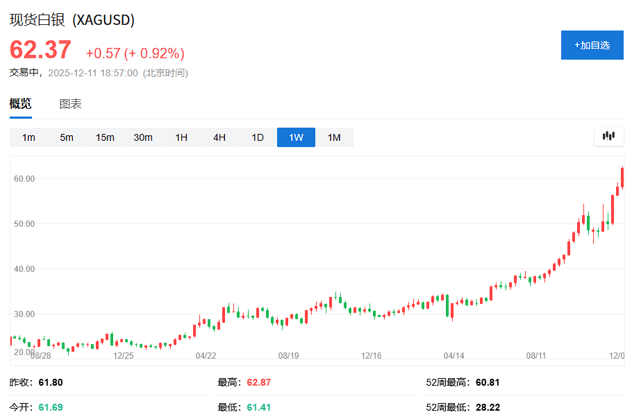 白银今年演绎了一场令市场瞩目的暴涨行情,不仅价格翻倍并屡创历史新高,表现更是超越黄金,有分析师预测这种"魔鬼金 属"的牛市才刚刚开始。 现货白银年内累计上涨114.6%,周三触及每盎司62.88美元的历史高位,截至发稿为62.37美元。白银期货同样飙升113%,本周首 次突破61美元关口。一天前,白银刚刚历史性地突破60美元大关。 工业需求成为关键驱动力 白银价格飙升的核心逻辑之一是其在关键工业领域的应用不断扩大。这种金属是电气开关、太阳能电池板和手机生产的关键组 件,也被用于支撑人工智能繁荣的硬件和基础设施。 白银协会周三发布的报告指出,白银优异的导电和导热性能对推动全球经济的技术转型越来越重要。 据华尔街见闻文章,该机构预计,未来五年全球白银工业需求将进一步增长,太阳能、电动汽车及其基础设施、数据中心和人工 智能等关键技术领域将推动工业需求持续走高至2030年。 (现货白银周线走势图) 分析指出,供应紧张、避险需求以及工业应用推动了这轮涨势。部分市场人士认为白银的上涨逻辑依然完整。Solomon Global董 事总经理Paul Williams表示,白银作为工业资源和价值储存工具的双重属性持续吸引资金流 ...