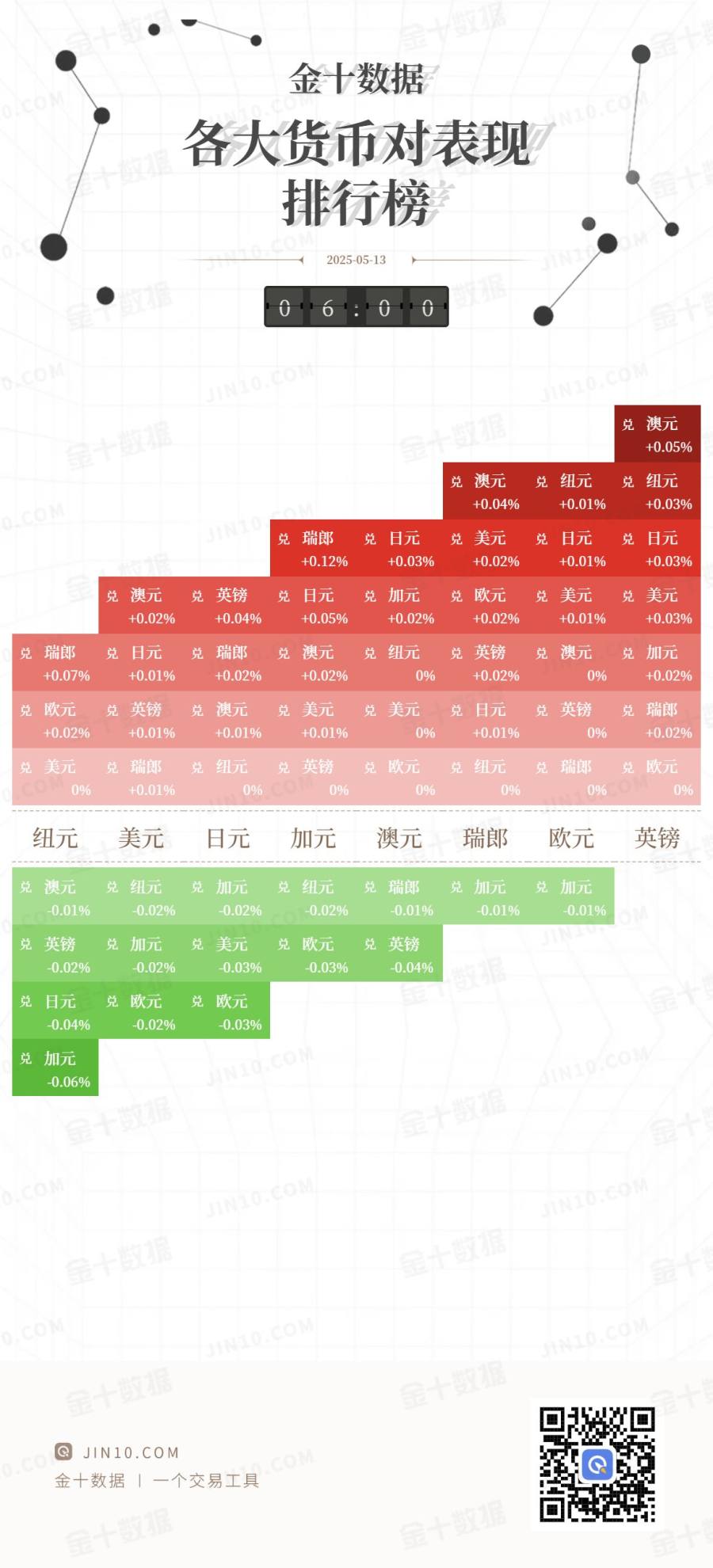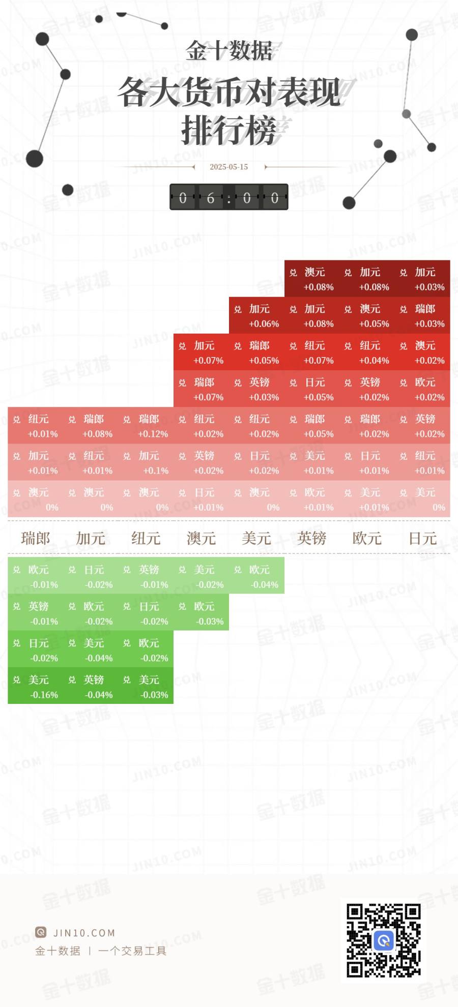 金十图示:2025年05月15日(周四)各大货币对表现 | -0.02% | -0.04% | | -0.02% | | --- | --- | --- | --- | | 兑 美元 | 兑 英镑 | 党 | 美元 | | -0.16% | -0.04% | | -0.03% | @ JIN10.COM GOM 金十数据 | 一个交易工具 011 CON ...