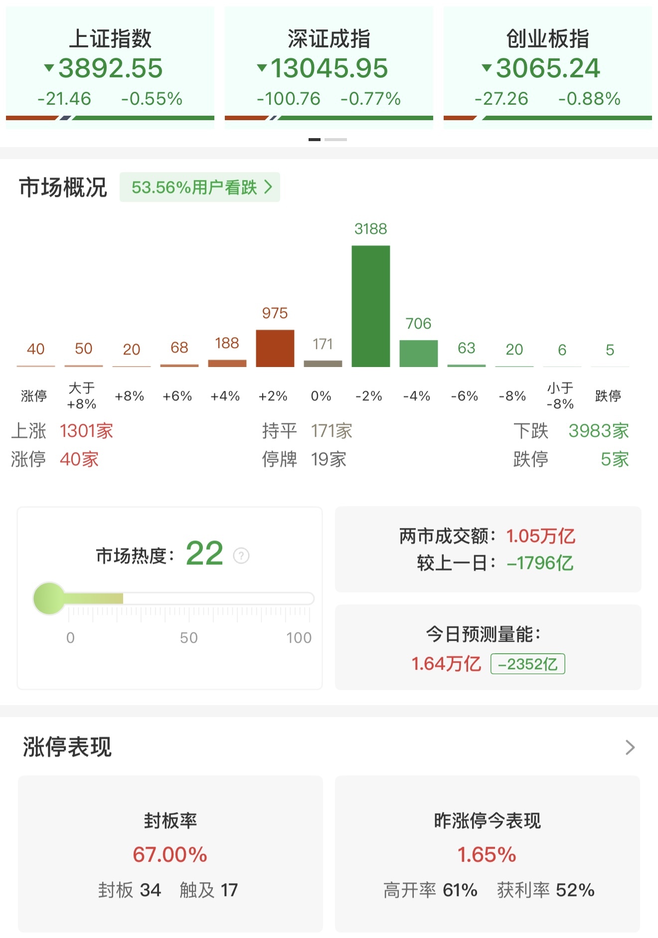 市场整体表现 - 12月2日早盘市场震荡走弱,三大指数集体下挫,沪指跌0.55%,深成指跌0.77%,创业板指跌0.88% [1] - 沪深两市半日成交额为1.05万亿元,较上个交易日缩量1796亿元 [1] - 全市场近4000只个股下跌 [1] 行业与板块表现 - 涨幅居前的板块包括医药商业、福建、海南等板块 [1] - 跌幅居前的板块包括电池、有色金属、影视院线等板块 [1] - 电池板块震荡下跌,石大胜华股价跌超7% [1] - 有色金属板块表现较弱,华锡有色股价跌近7% [1] 概念板块与个股异动 - 福建板块持续走强,海欣食品实现5连板,平潭发展实现3天2板 [1] - 商业航天概念表现活跃,航天发展实现13天9板,通宇通讯实现4连板 [1] - AI手机概念局部走强,道明光学实现4连板 [1] 市场情绪与涨停数据 - 当日涨停封板率为67.00%,封住涨停板34只,触及涨停板17只 [3] - 前一日涨停的股票在今日的平均表现为上涨1.65% [3] - 前一日涨停的股票今日高开率为61% [3]