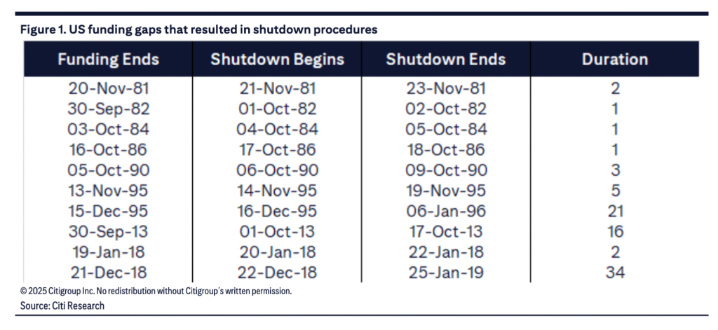 美国联邦政府时隔近七年再度"停摆",金融市场迎接新的不确定性。 历史数据显示,长期停摆将引发股票与债券走势的明显分化,并推升市场波动性,在此类情景下,黄金和白银等贵金属是比美元更可靠的避险工 具。 据知名预测市场Polymarket的数据,近70%的用户认为政府关门结束的时点最早也要到10月10日,更是有41%的用户认为至少持续到10月下旬。 报告还指出,此次停摆的一个新变量是,特朗普政府已指示各机构考虑永久性裁员,这可能比以往仅让政府雇员休假并事后补发薪水的做法带来 更具破坏性的经济影响,尽管具体细节尚不明确。 据追风交易台消息,花旗分析师Vinh Vo及其团队在其最新研报中指出,停摆时间的长短是决定资产表现的关键,而市场目前对此次停摆的定价可 能过于乐观,忽视了长期僵局可能带来的显著冲击。 报告将持续时间少于五天的归为"短期事件"(6次),超过五天的归为"长期事件"(4次)。 | Funding Ends | Shutdown Begins | Shutdown Ends | Duration | | --- | --- | --- | --- | | 20-Nov-81 | 21-Nov-81 | 23 ...