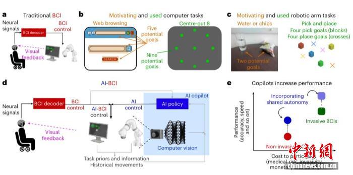 国际最新研究:AI可增强脑机接口操控力 中新网北京9月2日电 (记者 孙自法)施普林格·自然旗下专业学术期刊《自然-机器智能》最新发表一篇神 经科学论文指出,一个由人工智能(AI)担任"副驾"(copilot)的脑机接口或能让瘫痪患者更好地完成任 务。 这一利用AI增强脑机接口操控力的技术,能让瘫痪受试者在移动计算机光标或操作机械臂这类任务中 的表现提升为原先的近4倍。 本项研究的相关示意图(图片来自论文)。施普林格·自然 供图 该论文介绍,脑机接口能让用户利用脑信号操控装置,但它们通常不准确也不可靠。许多日常行动都是 目标驱动,有可预测的模式,如使用计算机或拿取物品。AI"副驾"或可通过解读意图和辅助行动的方式 提升用户操控力。 在本项研究中,美国加州大学洛杉矶分校科研团队成功研发出一个非侵入性脑机接口系统,该系统能通 过电极读取脑活动并利用机器学习优化行动操控力。该脑机接口有两个AI"副驾":一个能帮助引导计算 机光标,另一个能利用虚拟输入辅助机械臂任务。 论文作者认为,这种共享操控模式或使脑机接口在日常使用中更实用、更高效,随着AI系统的升级, 或能帮助用户更轻松地完成更多复杂任务。 他们也指出,虽然此 ...
