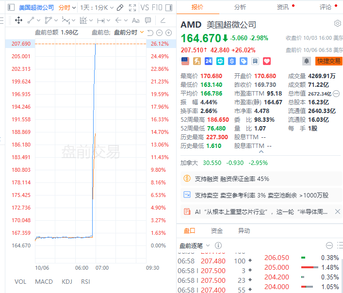 一笔"双赢"的重磅交易 根据AMD与OpenAI发布的联合声明,这项多年期协议的核心是构建一个规模空前的AI计算平台。AMD 首席财务官Jean Hu在声明中表示:"我们与OpenAI的合作预计将为AMD带来数百亿美元的收入,同时 加速OpenAI的AI基础设施建设。" 这笔交易的结构设计精巧,深度绑定了双方的长期利益。除了直接的芯片采购,协议还包括一份AMD 给予OpenAI的认股权证,允许其在达成特定里程碑后,最多可购买1.6亿股AMD股票。 10月6日周一,芯片制造商AMD与OpenAI签署协议。根据协议,OpenAI将在未来数年内部署总计6吉瓦 (GW)的AMD GPU算力。 这笔交易预计将为AMD带来数百亿美元的收入,或标志着AMD在利润丰厚的AI加速器市场向行业领导 者英伟达发起了迄今为止最猛烈的挑战。 消息公布后,AMD美股盘前涨超26%。 这些里程碑不仅包括技术部署进度,还与AMD未来的股价表现挂钩。其中一档行权条件甚至要求AMD 的股价达到600美元——一个雄心勃勃的目标,而根据报道,AMD上周五的收盘价为164.67美元。 AMD首席执行官Lisa Su对此合作表示振奋:"我们很高兴能与O ...