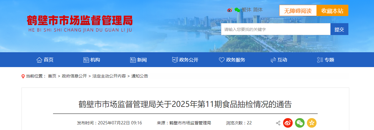 河南省鹤壁市市场监督管理局关于2025年第11期食品抽检情况的通告