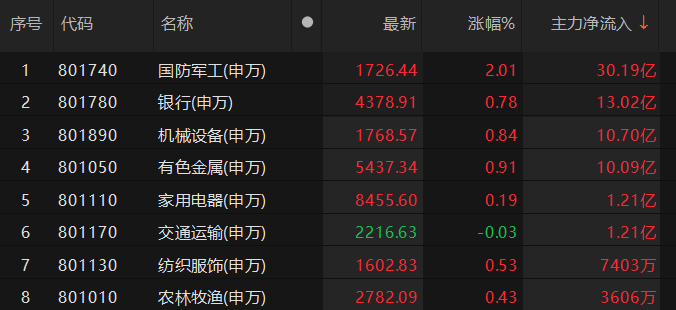 主力资金监控:国防军工板块净流入超47亿