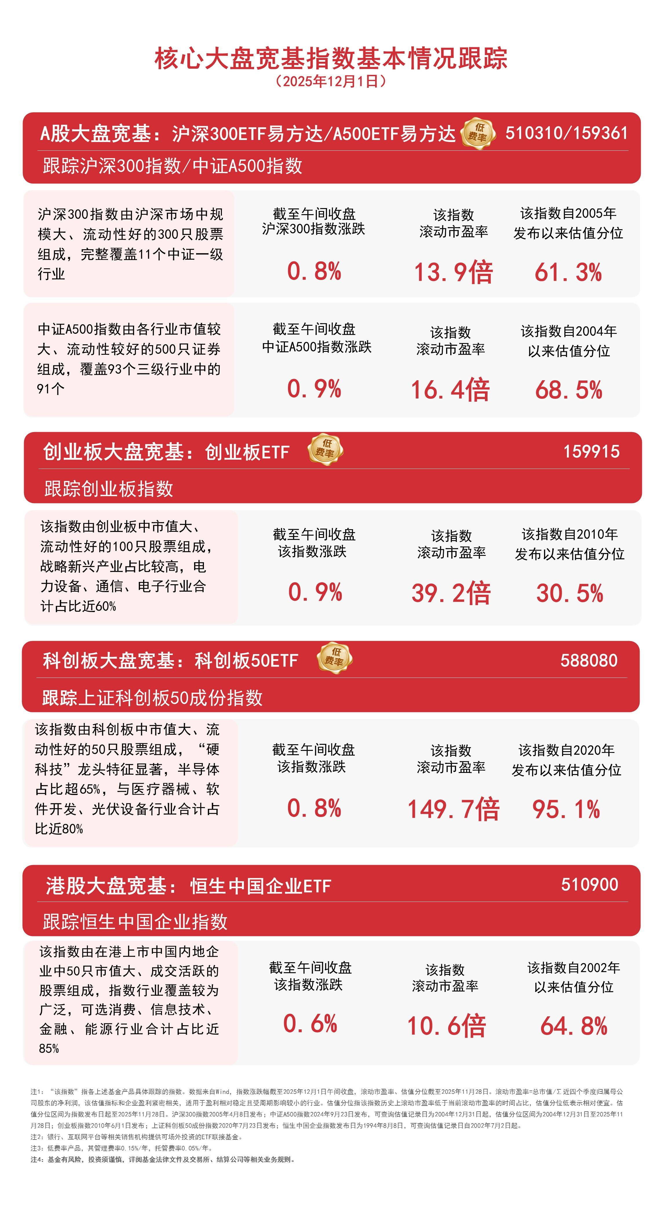 A股市场表现 - 三大指数集体上行,沪指半日涨0.4%重回3900点 [1] - 全市场超3600家个股上涨 [1] - 中证A500指数上涨0.9%,沪深300指数上涨0.8%,创业板指数上涨0.9%,上证科创板50成份指数上涨0.8% [1] 板块题材表现 - AI手机、AI眼镜、有色金属、商业航天板块涨幅居前 [1] - 互联网电商、保险、钛白粉、风电设备、多元金融板块跌幅居前 [1] 港股市场表现 - 港股震荡上行,恒生中国企业指数上涨0.6% [1] - 有色金属、消费板块涨幅居前,生物科技板块回调 [1] 创业板指数构成 - 创业板指数由市值大、流动性好的100只股票组成 [3] - 战略新兴产业占比较高,电力设备、通信、电子行业合计占比近60% [3] 科创板指数构成 - 上证科创板50成份指数由市值大、流动性好的50只股票组成 [3] - 半导体占比超65%,与医疗器械、软件开发、光伏设备行业合计占比近80% [3]