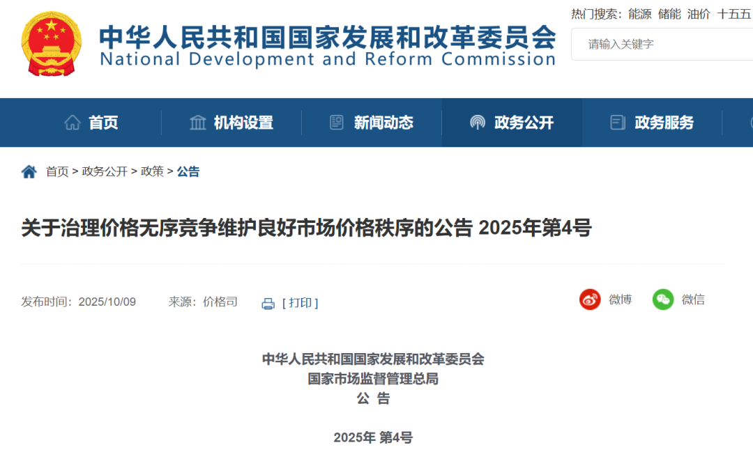 国家发展改革委网站10月9日消息,国家发展改革委、市场监管总局发布关于治理价格无序竞争维护良 好市场价格秩序的公告。全文如下: 中华人民共和国国家发展和改革委员会 国家市场监督管理总局 公告 2025年第4号 价格竞争是市场竞争的重要方式之一,但无序竞争会对行业发展、产品创新、质量安全等造成负面影 响,不利于国民经济健康发展。为规范市场价格行为,维护良好市场价格秩序,助力高质量发展,现就 有关事项公告如下。 一、实行市场调节价的商品和服务,经营者应当按照《中华人民共和国价格法》规定,遵循公平、合法 和诚实信用的原则,以生产经营成本和市场供求状况为基本依据,依法行使自主定价权,自觉维护市场 价格秩序,共同营造公平竞争、有序竞争的市场环境。 二、对价格无序竞争问题突出的重点行业,行业协会等有关机构在国家发展改革委、市场监管总局和行 业主管部门指导下,可以调研评估行业平均成本,为经营者合理定价提供参考。 三、发展改革、市场监管部门要会同行业主管部门加强政策宣贯,提示经营者依法合规经营,提升产品 质量和服务水平。对涉嫌价格无序竞争的经营者进行提醒告诫,要求其自觉规范价格行为,严守价格竞 争底线。 国家发展改革委 市场 ...