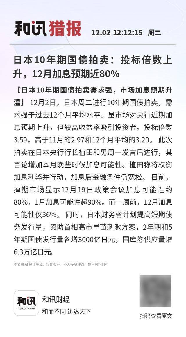 日本10年期国债拍卖情况 - 12月2日日本10年期国债拍卖需求强劲,投标倍数达到3.59,高于11月的2.97和过去12个月的平均水平3.20 [1] - 较高的收益率吸引了投资者,尽管市场对日本央行近期加息的预期有所上升 [1] 日本央行政策预期 - 日本央行行长植田和男发言后,市场对加息的预期显著升温,其言论增加了本月晚些时候加息的可能性 [1] - 植田和男表示将权衡加息利弊并采取行动,并指出加息后金融条件仍将保持宽松 [1] - 掉期市场显示,12月19日政策会议加息可能性约为80%,1月加息可能性超过90%,而一周前12月加息可能性仅为36% [1] 日本政府债务发行计划 - 日本财务省计划增加短期债务发行量,以资助刺激方案,2年期和5年期国债发行量各增加3000亿日元 [1] - 国库券供应量将增加6.3万亿日元 [1][3]