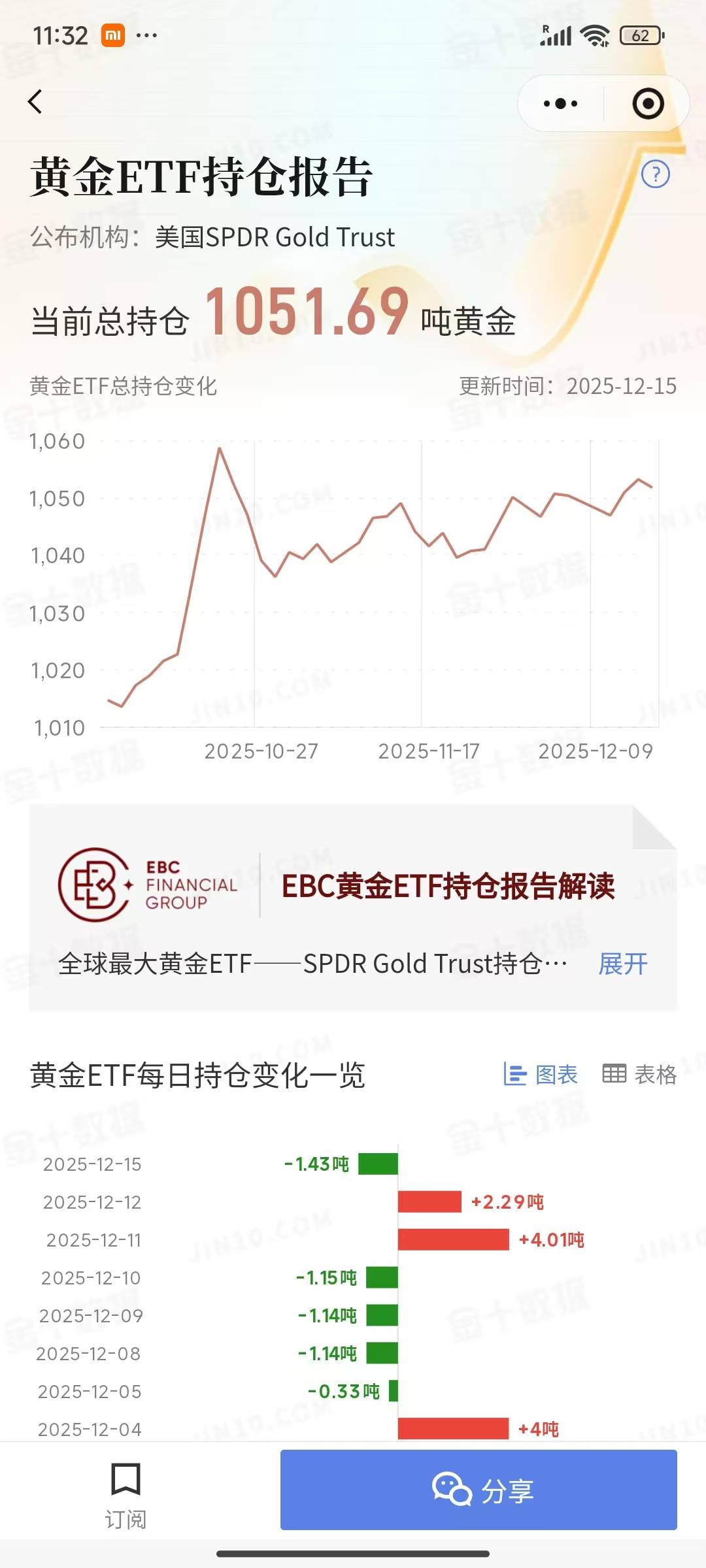 11:32 ml 黄金ETF持仓报告 公布机构:美国SPDR Gold Trust 当前总持仓 1051.69 吨黄金 黄金ETF总持仓变化 更新时间:2025-12-15 1.060 1.050 1.040 1,030 1.020 1.010 2025-10-27 2025-11-17 2025-12-09 EBC黄金ETF持仓报告解读 SPDR Gold Trust持仓 … 全球最大黄金ETF- 展开 基本面消息,周一,金价一度触及4350美元,在重磅数据前夕,交易员获利了结令金价回吐早前涨幅,但是仍然守住4300美元/盎司关口。市场对美联储 主席人选的不确定性以及本周密集的经济数据保持谨慎。尽管美元持续疲软为黄金提供了支撑,但美国股市尾盘大幅下挫令贵金属涨势受限。 关于美联储主席人选,最新消息指出,特朗普属意的美联储主席候选人哈塞特(Kevin Hassett)因被认为与总统"过于亲近"而遭到特朗普高级顾问的反 对。这一消息引发市场对美联储独立性的担忧,拖累美股走低。与此同时,前美联储理事沃尔什(Kevin Warsh)作为替代人选的呼声开始上升。 此外,投资者在本周一系列重磅经济数据公布前保持谨慎态度 ...