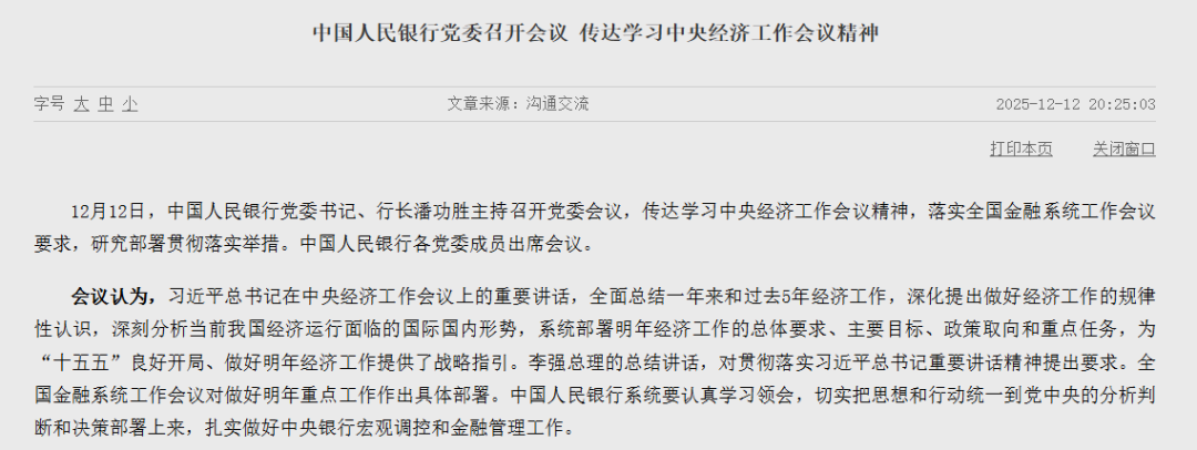 中国人民银行消息,12月12日,中国人民银行党委书记、行长潘功胜主持召开党委会议,传达学习中央经济工作会议精神,落实全国金融系统工作会议要 求,研究部署贯彻落实举措。 | | 文章来源:沟通交流 | 2025-12-12 20:25:03 | | --- | --- | --- | | 字号 大 中 少 | | | 图片来源:中国人民银行 做好房地产金融宏观审慎管理 会议强调,继续实施适度宽松的货币政策,加快推进金融供给侧结构性改革。把促进经济稳定增长、物价合理回升作为货币政策的重要考量,灵活高效运 用降准降息等多种货币政策工具,把握好政策实施的力度、节奏和时机,保持流动性充裕,促进社会综合融资成本低位运行,加强对实体经济的金融支 持。 要 点 速 览 继续实施适度宽松的货币政策 发挥存量政策和增量政策集成效应 加强货币政策执行和传导 灵活高效运用降准降息等多种货币政策工具 促进社会综合融资成本低位运行 优化结构性货币政策工具运用 保持人民币汇率在合理均衡水平上的基本稳定 坚定维护金融市场平稳运行 稳步发展数字人民币 会议强调,做好明年中国人民银行工作,要全面贯彻党的二十大和二十届历次全会精神,认真贯彻中央经 ...