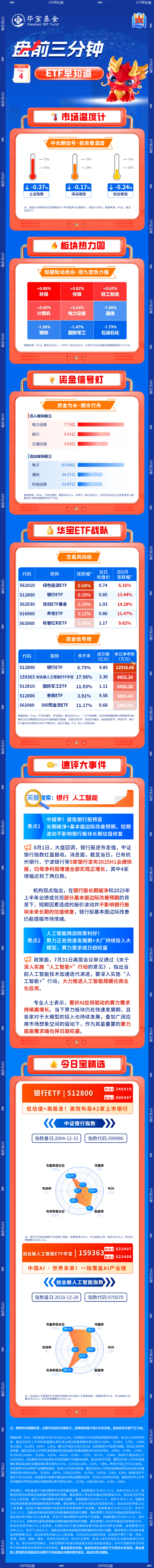 >>>>> ETF早知道 >>>>> ETF早知道 FFFFRS bao (CCC >>>>> F0+9 -2025 即隔知道 Aug A ETFEFR通 (44) 市场温度计 >>>>>> ETFIFA 中长期信号 · 投资看温度 --- 75% + 75% --- 75% -- + 25% -+ 25% -- > 25% ETFEFRE <<<< -0.24% -0.37% J-0.17% > > 上证指数 深证成指 创业板指 注:温度计水银条由对应指数的近十年市盈率分位数表示,总值为100%。数据来源:iFind,截至 2025.8.1 ETFEF e e ( 6 板块热力图 ETFEFR汽 <<<< 短期轮动走向·观九宫热力值 +0.88% +0.82% +0.65% 传媒 环保 轻工制造 FEFR +0.60% +0.54% -1.06% 计算机 电力设备 遛信 -1.26% -1.79% -1.47% 钢铁 国防军工 石油石化 数据来源:iFind,截至2025.8.1,以申万一级行业区分,分别列出当日涨幅及跌幅靠前的4-5个行业。 (CCCC 0 0 0 0 ● 资金信号灯 TFF 97 资金为 ...