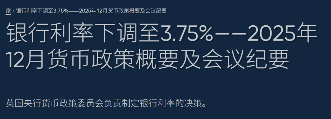 【导读】英国央行降息了 大家好,英国央行降息25个基点。 12月18日晚间,英国央行在圣诞节前下调利率,将基准利率降至近三年来最低水平,为英国居民"过节减负",并暗示通胀降温的力度足以让其在2026年进 一步放松货币政策。 英国央行货币政策委员会(MPC)周四公布的会议纪要显示,委员会以5票赞成、4票反对的结果,决定将基准利率下调25个基点至3.75%。这是自8月以 来的首次降息——这个由9名成员组成的委员会在过去两次利率决议中都按兵不动。 英国央行行长安德鲁·贝利支持这次市场普遍预期的宽松举措,原因是近几天公布的一系列数据表明,经济增长、就业市场以及物价压力都在走弱。英国 央行目前预计,明年春季通胀将回落到"更接近"其2%的目标;本周数据显示,消费者物价意外降至八个月低点。 委员会表示,现有证据显示明年借贷成本仍会继续下降。不过,英国央行在新的表述中也提醒,未来是否继续降息将是"微妙的平衡":随着央行逐步接 近"中性利率"(既不推高通胀,也不压低通胀的利率水平),每一次决策都会更加纠结。 贝利在随会议纪要发布的声明中说:"我们仍认为利率会沿着逐步下行的路径前进。但每降一次息,我们还能走多远,就会变得更难判断 ...