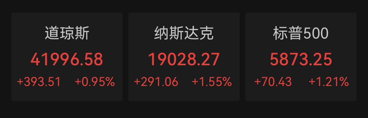 北京时间5月27日晚,美股三大指数集体高开,道指上涨0.95%,纳指上涨1.55%,标普500指数上涨1.21%。 | 未来 成分 | 资讯 | 相关基金 | | --- | --- | --- | | 名称 | 现价 | 涨跌幅 ◆ | | 特斯拉(TESLA) | 350.610 | 3.32% | | TSLA.O | | | | 英伟达(NVIDIA) | 134.230 | 2.24% | | NVDA.O | | | | 苹果(APPLE) | 198.800 | 1.81% | | AAPL.O | | | | 微软(MICROSOFT | 458.420 | 1.83% | | MSFT.O | | | | 谷歌(ALPHABET)· | 172.385 | 1.65% | | GOOG.O | | | | 亚马逊(AMAZON) | 204.145 | 1.57% | | AMZN.O | | | | 脸书(META PLATF | 636.780 | 1.55% | | META.O | | | 热门中概股涨跌不一,纳斯达克中国金龙指数微跌0.3%。腾讯音乐上涨1.74%,满帮集团上涨1. ...