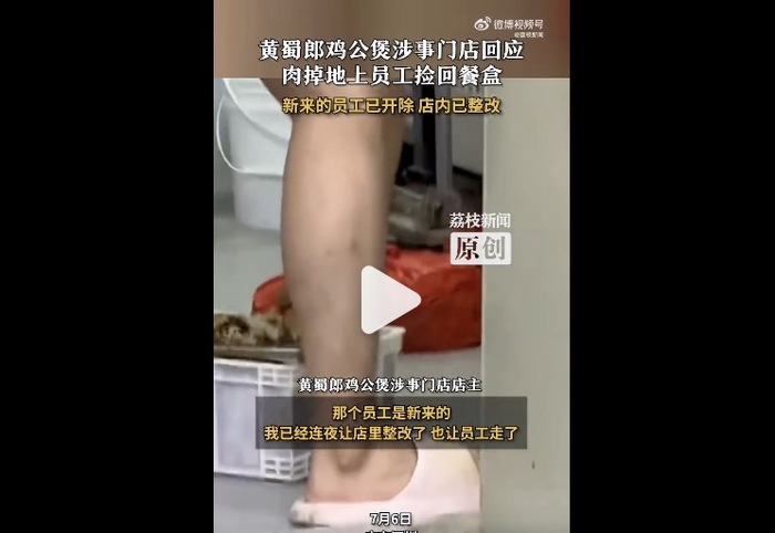 黄蜀郎鸡公煲被曝员工将掉地肉捡回餐盒, 涉事门店回应已开除员工并整改