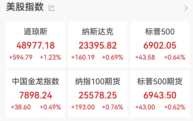美东时间周一,美国三大股指全线收涨,道指深夜狂飙近600点,最终收涨逾1%报48977.18点,再创历史新高;芯片股表现亮眼,中概股多数上涨,脑再 生科技表现强劲,收盘涨幅达31%;受地缘政治局势影响,国际油价、金价银价继续走强。 | 美股指数 它 | | | | --- | --- | --- | | 道琼斯 | 纳斯达克 | 标普500 | | 48977.18 | 23395.82 | 6902.05 | | +594.79 +1.23% +160.19 +0.69% | | +43.58 +0.64% | | 中国金龙指数 | 纳指100期货 | 标普500期货 | | 7898.24 | 25578.25 | 6943.50 | | +38.60 +0.49% +193.00 +0.76% | | +43.00 +0.62% | 大型科技股涨跌互现,万得美国科技七巨头指数上涨0.41%。个股方面,特斯拉涨超3%,亚马逊涨近3%,脸书涨超1%,谷歌涨0.44%,苹果跌超1%,英 伟达跌0.39%,微软跌0.02%。 芯片股涨跌不一,费城半导体指数涨1.07%,科天半导体涨超6%,应用材料涨逾5%,阿斯 ...