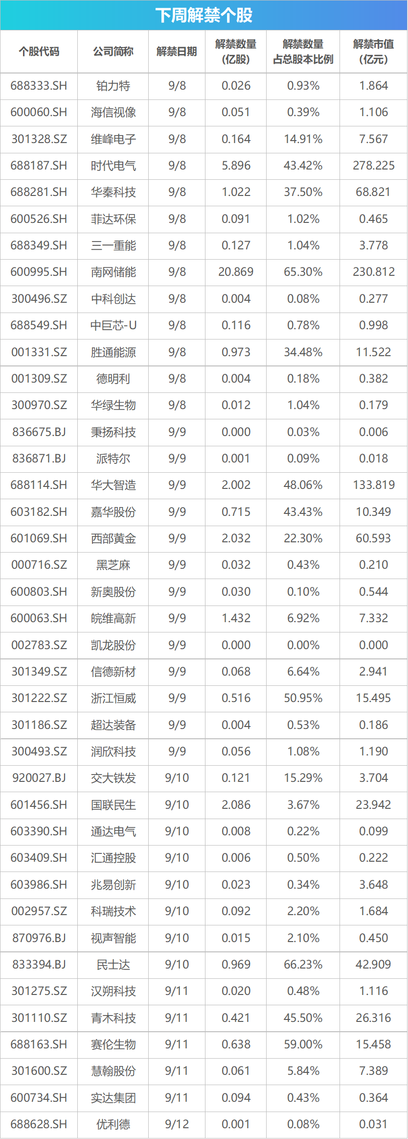 宏观经济数据发布 - 国家统计局将于9月10日发布8月CPI和PPI月度报告 此前7月CPI同比持平 环比上涨0.4% 7月PPI同比下降3.6% 环比下降0.2% [1] 能源价格调整 - 国内成品油调价窗口于9月9日24时开启 参考原油均价66.06美元/桶 变化率1.52% 预计汽柴油零售价上调75元/吨 [2] 科技行业动态 - 苹果将于9月10日举办秋季新品发布会 预计推出iPhone17系列四款机型 [3] - 科创板指数9月12日进行季度调样 科创50指数调入生益电子 总市值3.1万亿元 覆盖率38.9% 科创100指数调入5只证券 总市值1.9万亿元 覆盖率24.4% 科创板系列指数总市值覆盖率提升至84.6% [4] 指数成分调整 - 恒生指数9月8日调整生效 成分股数量由85只增至88只 新增中国电信、京东物流和泡泡玛特 恒生生物科技指数和恒生综合指数同步调整 [5] - 中证指数公司9月10日发布中证A500成长指数和中证A500价值指数 9月11日发布四条新指数包括中证A500相对成长指数和相对价值指数等 [6] 重要会议活动 - 2025 Inclusion·外滩大会9月10-13日举行 主题"重塑创新增长" 覆盖金融科技、人工智能和云计算领域 [7] - 2025年服贸会9月10-14日在北京举办 中国国际投资贸易洽谈会9月8-11日在厦门举行 [7] - 广东国际旅游产业博览会9月12-14日在广州举办 汇聚全球近50个国家地区参展机构和超100个旅游目的地 [7] 限售股解禁 - 下周40家公司限售股解禁 总解禁量40.8亿股 解禁市值966.01亿元 [8] - 时代电气解禁市值278.23亿元 解禁数量5.896亿股 占总股本43.42% [9] - 南网储能解禁市值230.81亿元 解禁数量20.869亿股 占总股本65.3% [9] - 华大智造解禁市值133.82亿元 解禁数量2.002亿股 占总股本48.06% [10] 新股发行 - 下周3只新股发行:世昌股份9月9日发行价10.9元/股 昊创瑞通9月11日发行 友升股份9月12日发行 [11] - 世昌股份申购代码920022 申购上限74.57万股 [12] - 昊创瑞通申购代码301668 申购上限0.65万股 [12] - 友升股份申购代码603418 申购上限1.5万股 [12]