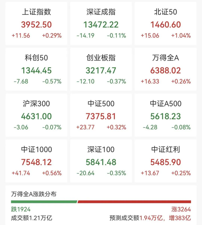 【导读】汽车零部件、多元金融等板块表现活跃 中国基金报记者 李智 一起来看下最新的市场情况及资讯。 12 月 25 日上午, A 股市场走势分化,截至午间收盘,沪指涨 0.29% ,深成指跌 0.11% ,创业板指跌 0.37% 。 | 上证指数 | 深证成指 | 北证50 | | --- | --- | --- | | 3952.50 | 13472.22 | 1460.60 | | +11.56 +0.29% -14.19 -0.11% +15.06 +1.04% | | | | 科创50 | 创业板指 | 万得全A | | 1344.45 | 3217.47 | 6388.02 | | -7.68 -0.57% -12.10 -0.37% +16.33 +0.26% | | | | 沪深300 | 中证500 | 中证A500 | | 4631.00 | 7375.81 | 5618.23 | | -3.06 -0.07% +23.77 +0.32% -4.28 -0.08% | | | | 中证1000 | 深证100 | 中证红利 | | 7548.12 | 5841.48 | 5485.90 | ...
