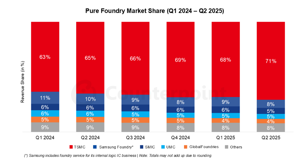 行业整体表现 - 2025年第二季度全球纯晶圆代工行业营收同比增长33% [1] - 行业增长主要得益于强劲的AI需求和中国补贴政策 [1] - 先进工艺节点的晶圆代工厂利用率以及各代工厂的晶圆出货量预计将继续增长 [6] 主要厂商市场份额 - 台积电在2025年第二季度市场份额达到71% 较2024年第一季度63%的份额显著提升 [4][7] - 三星代工稳居全球第二位 2025年第二季度市场份额为8% [4][7] - 中芯国际位列第三 2025年第二季度市场份额为5% [4][7] 厂商增长驱动因素 - 台积电增长得益于3纳米产能扩大 AI GPU在4/5纳米制程的高利用率以及CoWoS技术扩展 [7] - 三星代工主要受益于智能手机和其他消费电子设备的回暖 [7] - 中芯国际预计将继续向更先进的制程节点迈进 [7]