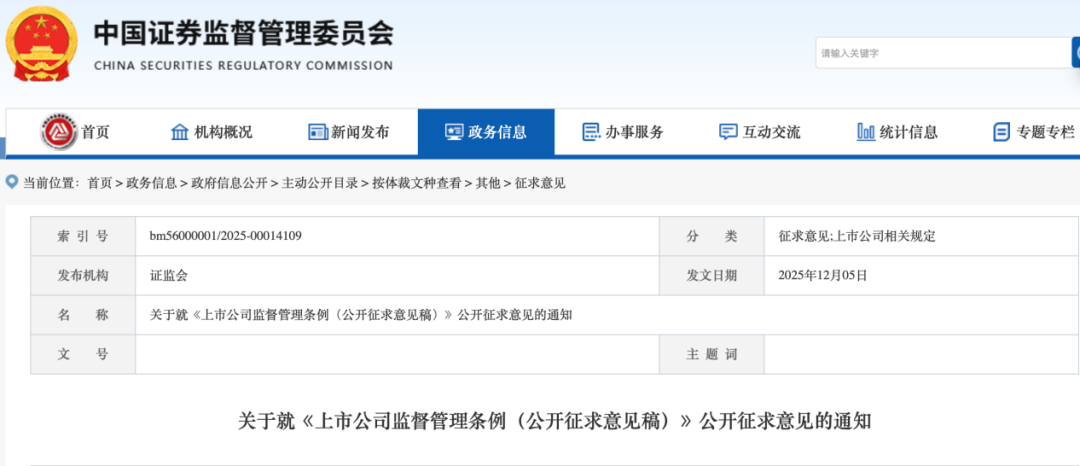 【导读】中国证监会就《上市公司监督管理条例(公开征求意见稿)》公开征求意见 我国将迎来首部专门的上市公司监管行政法规! 12月5日,中国证监会发布《上市公司监督管理条例(公开征求意见稿)》。 为了规范上市公司及相关各方在证券市场的行为,加强对上市公司的监督管理,促进上市公司质量提升,保护投资者合法权益,根据《公司法》《证券 法》等法律规定,中国证监会起草了《上市公司监督管理条例(公开征求意见稿)》(以下简称《条例》),现向社会公开征求意见。 中国证监会表示,上市公司是资本市场的基石。近年来,上市公司规模快速增长、结构持续优化、质量不断提升,有力支持了资本市场和实体经济的健康 发展,但和建设现代化产业体系、实现经济高质量发展、加快建设更多世界一流企业的要求相比,还存在一些差距,部分上市公司仍存在治理机制不健 全、信息披露不合规、董监高不尽职、大股东行为不规范等问题。出台《条例》是增强基础法治供给、推动提高上市公司质量的必然要求。 《条例》共八章、七十四条,意见反馈截止时间为2026年1月5日。 以下为主要内容: 一是完善上市公司治理要求,规范治理架构以及控股股东、实际控制人、董事、高管等关键少数的行为,促进提升 ...