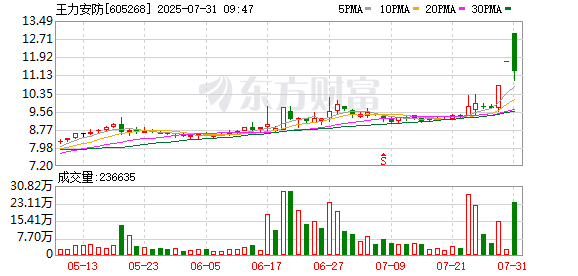 股价表现 - 王力安防7月30日涨停 涨幅达10 02% 最新价11 75元 [1] - 封板资金达5 50亿元 成交额0 10亿元 换手率0 20% [1] - 7月29日该股以10 68元涨停收盘 涨停板封单金额达2 06亿元 [1] 交易数据 - 7月29日平均每笔成交量达2021股 环比增长157 58% [1] - 单笔成交增幅位列沪深两市第三位 [1]