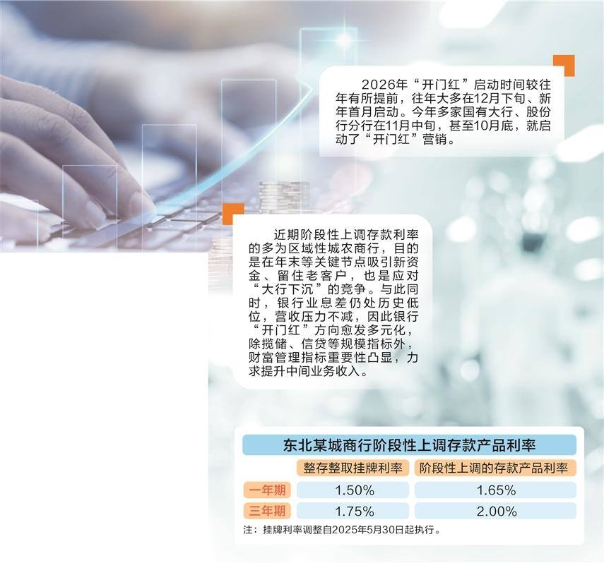 银行业“开门红”备战动态 - 12月以来,多家城商行阶段性上调存款利率以吸引储户,幅度高达25个基点 [1] - 除揽储外,银行亦重点发力理财、基金等财富管理产品,并推出费率优惠 [1] - 近期上调利率的多为区域性城农商行,旨在年末等关键节点吸引新资金、留住老客户,并应对“大行下沉”的竞争 [1] 中小银行存款利率上调案例 - 盛京银行推出三年期存款产品,年化利率达1.95%,起存金额为10000元,并限定对在该行存有20万及以上金融资产的客户开放 [2] - 吉林银行推出“吉享存A款”,三年期年利率为2.0%,一年期年利率为1.65%,起存金额1000元 [3] - 相较于官网挂牌利率(三年期1.75%、一年期1.5%),吉林银行前述产品利率分别阶段性上调了25个基点和15个基点 [3] - 专家指出,部分银行利率上调是典型的阶段性揽储行为,特别是中小银行为应对存款竞争、完成业绩考核的直接手段 [3] 财富管理业务重要性提升 - 多家银行将“开门红”重点转向财富管理,发力理财、基金、银保等多个细分产品,力求“多点开花” [4] - 有城商行客户经理推荐理财子公司固收类产品,年化收益在3%左右 [4] - 中银理财两款产品费率由0.2%降至0.01%,降幅达19个基点,活动截止年底 [4] - 在中国银行东北某分行2026年个金条线营销启动会上,“财富管理”在12项指标中名列前茅 [4] - 高淳农商银行在“开门红”启动会上,将财富业务与存款、贷款等并列为核心目标任务 [4] - 力推财富管理业务是为应对客户需求变化和内外部挑战,因房地产市场调整,居民财富正加快从房地产流向金融资产 [4] - 当前银行净息差处于历史低位,发展财富管理业务有助于创造稳定的非利息收入,优化收入结构 [5] “开门红”策略与行业趋势 - 2026年“开门红”启动时间较往年有所提前,多家国有大行、股份行分行在11月中旬甚至10月底就已启动 [6] - 在经济弱复苏、居民风险偏好下降、存款定期化趋势延续的背景下,“开门红”提前启动和营销加码可能成为未来几年常态 [6] - 专家建议银行应摆脱“唯规模论”,从“规模扩张”向“价值创造”转变,强化客户洞察、推动产品服务差异化,并将客户质量、中收贡献等纳入综合评价 [6] - 多位从业者坦言,本次“开门红”揽储压力未减,在存款、普惠贷、个人养老金开户缴存、信用卡催收等多重指标叠加下,完成压力较大 [6] - 银行长期稳健发展的核心在于从战略上摆脱对短期规模冲刺的路径依赖,将“开门红”转变为全年服务客户、创造价值的起点 [6]