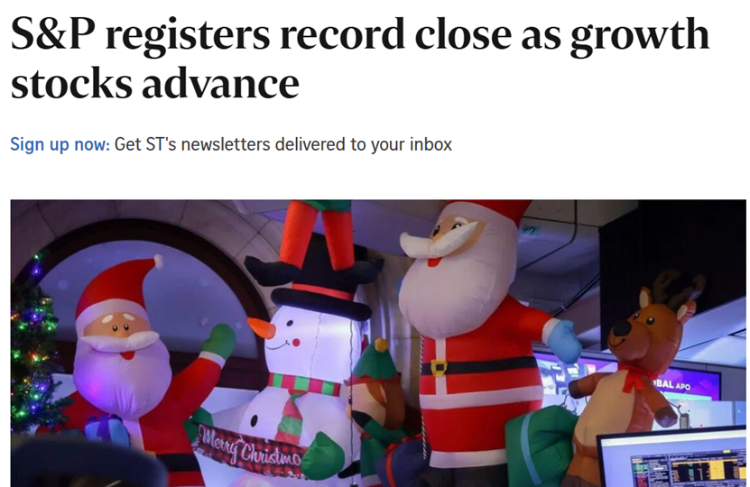 美股市场表现 - 美国股市周二收高,标普500指数创下收盘新高,道琼斯工业指数上涨79.73点涨幅0.16%至48442.41点,标普500指数上涨31.30点涨幅0.46%至6909.79点,纳斯达克指数上涨133.02点涨幅0.57%至23561.84点 [2] - 标普500成长股指数上涨0.8%,而价值股指数基本持平,市场资金更青睐具备盈利确定性的成长型龙头 [2] - 大型科技股整体走强,英伟达上涨3.01%为标普500指数提供最大支撑,博通上涨2.30%,亚马逊上涨1.62%,谷歌A股上涨1.48%,谷歌C股上涨1.40%,苹果上涨0.51%,微软上涨0.40%,Meta上涨0.52%,特斯拉则小幅下跌0.65% [2] - 人工智能相关股票延续反弹,扭转了上周因估值偏高及资本开支压力引发的回调 [2] 中概股与行业板块 - 中概股表现分化,阿里巴巴上涨0.18%,拼多多上涨0.13%,骇维金属加工大涨50.60%,百度下跌0.47%,京东微跌0.03%,腾讯控股ADR下跌1.70%,蔚来下跌2.20%,阿特斯太阳能大跌11.80% [3] 宏观经济数据 - 美国第三季度国内生产总值环比年率增长4.3%,为2023年第三季度以来最快增速,高于经济学家预期的3.3%,主要受消费者支出拉动 [3] - 美国12月消费者信心指数降至89.1,低于11月修正后的92.9,为今年4月以来最低水平,反映出就业和收入前景担忧加深 [3] 债券与利率市场 - 受经济增长数据超预期影响,美债短端收益率走高,市场对美联储年初降息的押注有所降温,两年期美债收益率上涨3.81个基点至3.544% [3][4] - 10年期美债收益率尾盘报4.171%基本持平 [4] - 美国财政部当日标售700亿美元五年期国债,投标倍数为2.35,低于历史平均水平 [4] - 有分析认为美联储正在为明年初“暂停降息”铺路,这对中期国债并非利好 [4] 大宗商品市场 - 现货白银上涨3%至每盎司71.06美元,再创历史新高,今年累计涨幅达145%,长期供给短缺与工业需求上升是主要推动力 [4] - 现货黄金上涨0.8%报每盎司4478.52美元,盘中刷新纪录高位 [4] - 国际油价小幅走高,纽约原油期货收于每桶58.38美元 [5]