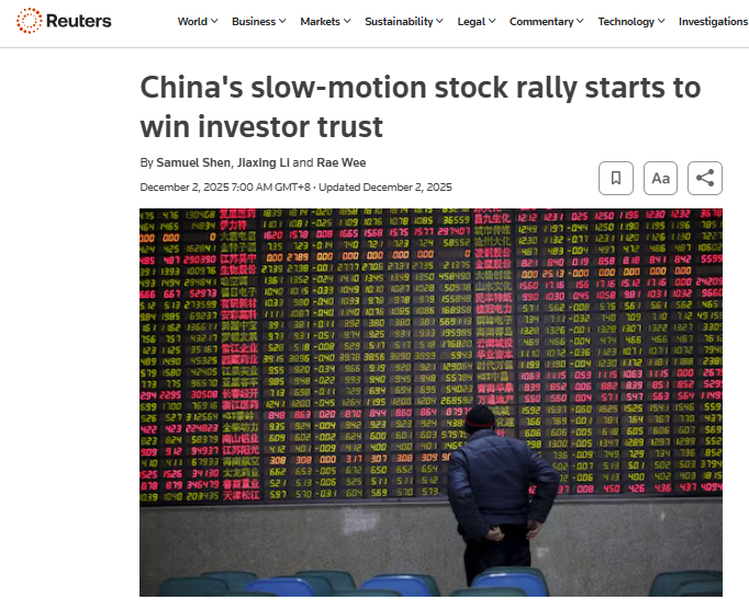 A股市场开户数据 - 2024年11月A股市场新开户238.14万户,环比增长3.1%,但同比下降11.75% [1] - 2024年前11个月A股市场累计新开户2484.02万户,同比增长7.95% [1] 主要股指表现与资金动向 - 截至报道时,中国沪深300指数年内上涨约16%,表现与标普500指数相当 [1] - 香港恒生指数势头强劲,有望创下自2017年以来的最大年度涨幅 [1] - 基金经理当前的投资策略是买入中国工业股,同时持有波动的科技股 [1] 外资观点与市场展望 - 估值和稳定的回报正吸引外国投资者重新回归中国股市 [2] - 摩根士丹利首席中国股票策略师认为,外国投资者逐渐回归中国,这标志着一个渐进再分配过程的开始 [2] - 国泰海通证券认为2025年12月至2026年2月是中国政策、流动性、基本面向上共振的窗口期,建议增持中国市场并做多跨年行情 [2] - 东吴证券认为12月市场交易结构有望改善,宏观流动性有望保持合理投放,市场资金博弈可能促使春季行情提前演绎 [2]