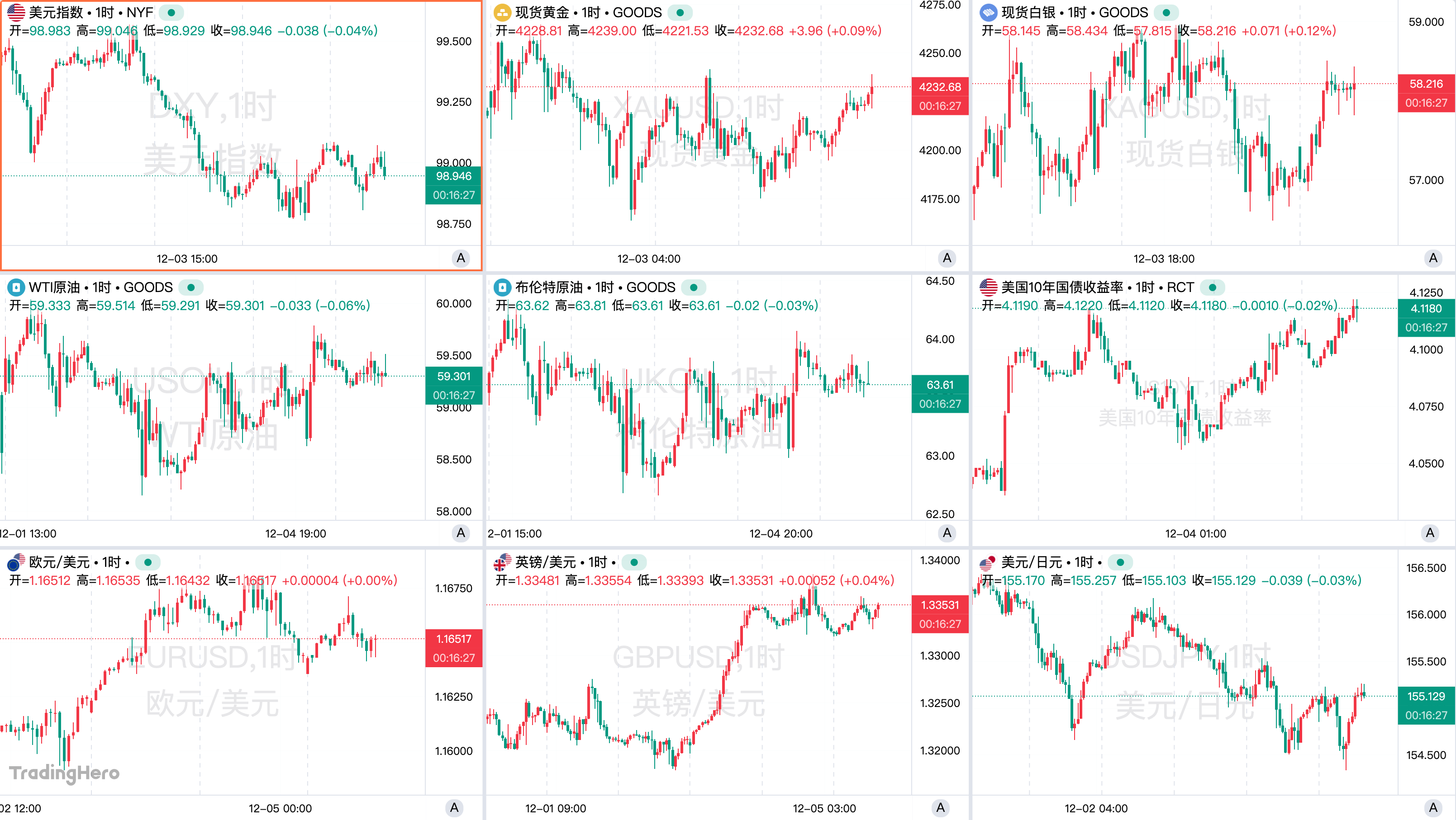 报告行业投资评级 - 美元走势评级为震荡 [5] 报告的核心观点 - 本周市场维持风险偏好温和回升走势,美国经济数据显示经济下行趋势未改,12月降息基本成定局,美元指数下行压力上升,等待美联储利率会议确认降息 [36][37] 各部分总结 全球市场本周概述 - 市场风险偏好维持高位,股市多数上涨,债券收益率多数上行,美债收益率升至4.14%,美元指数跌0.47%至99,非美货币多数升值,金价跌1%至4198美元/盎司,VIX指数降至15.4,现货商品指数收涨,布油涨0.4%至64.6美元/桶 [1][9] 市场交易逻辑及资产表现 股票市场 - 全球股市多数上涨,标普500指数涨0.31%,上证指数涨0.37%,港股恒生指涨0.87%,日经225指数涨0.47%,国内股市走势震荡微涨 [10][11] 债券市场 - 全球国家债券收益率多数下行,10年美债收益率回升至4.14%,日本长债收益率走高带动欧美债券收益率同步回升,中国10年期国债收益率震荡收涨于1.833%,中美利差倒挂扩大至230bp [18][19][21] 外汇市场 - 美元指数跌0.47%至99,非美货币多数升值,离岸人民币微涨0.02%,欧元涨0.38%,英镑涨0.7%,日元涨0.54%,加元、澳元、兰特涨超1%,新西兰元、比索、泰铢、林吉特收涨,雷亚尔跌超2% [25][28] 商品市场 - 现货黄金跌1%至4198美元/盎司,短期延续震荡走势,布伦特原油涨0.4%至64.6美元/桶,大宗商品现货指数收涨 [31] 热点跟踪 - 美国核心PCE不及预期,就业减少,9月核心PCE同比2.8%,11月ADP新增就业 -3.2万人 [32][36] 下周重要事件提示 - 周一中国11月进出口数据,周二美国11月NFIB小型企业信心指数和10月JOLTs职位空缺,周三中国11月CPI和加拿大央行利率会议,周四美联储利率会议决议、美国当周首申和11月PPI,周五德国、法国11月CPI终值 [38]