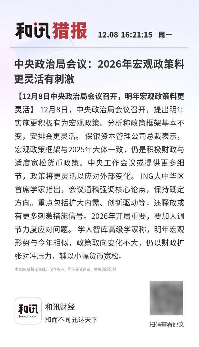 【12月8日中央政治局会议召开,明年宏观政策料更灵活】12月8日,中央政治局会议召开,提出明年实 施更积极有为宏观政策。分析称政策框架基本不变,安排会更灵活。保银资本管理公司总裁表示,宏观 政策框架与2025年大体一致,仍是积极财政与适度宽松货币政策。中央工作会议或提供更多细节,政策 将更灵活以应对外部变化。ING大中华区首席学家指出,会议通稿强调核心论点,保持既定方向。重点 包括扩大内需、创新驱动等,还释放或有更多刺激措施信号。2026年开局重要,要加大调节力度应对问 题。学人智库高级学家称,明年宏观形势与今年相似,政策取向变化不大,仍以财政扩张对冲压力,辅 以小幅货币宽松。 本文由 AI算法生成,仅作参考,不涉投资建议,使用风险自担 和讯财经 FUL hexun.con 和而不同 迅达天下 扫码查看原文 本文由 Al 算法生成,仅作参考,不涉投资建议,使用风险自担 ...
