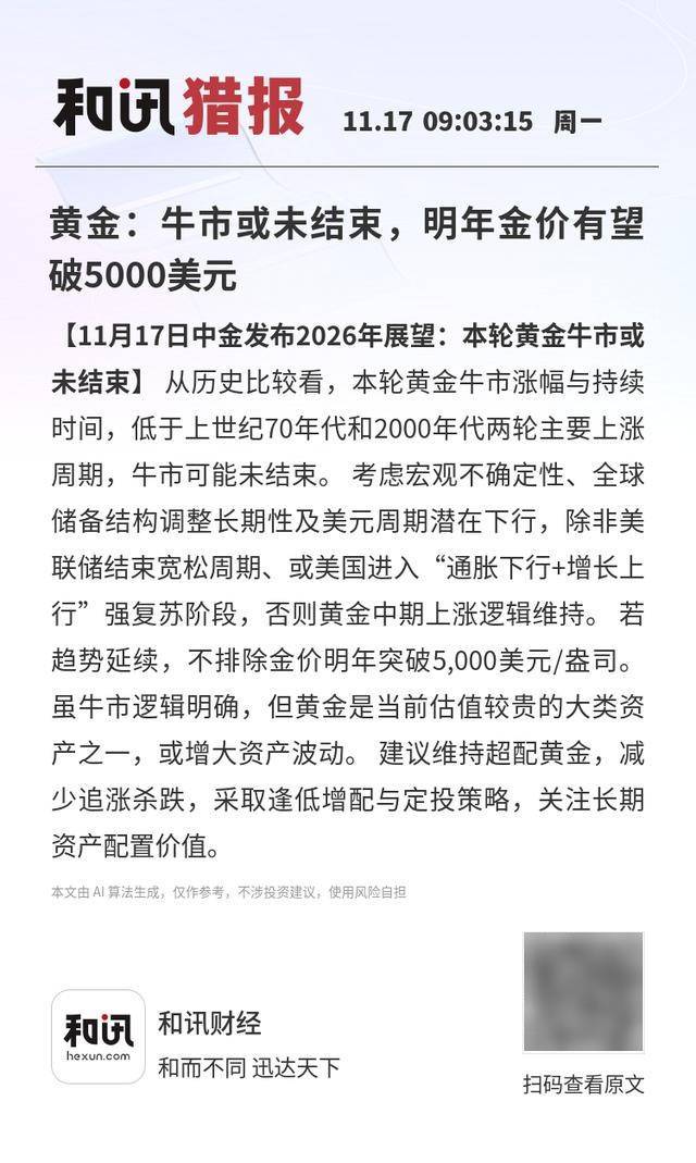 黄金市场展望 - 中金公司发布2026年展望,认为本轮黄金牛市可能尚未结束,其涨幅与持续时间仍低于上世纪70年代和2000年代的两轮主要上涨周期 [1] - 支撑黄金中期上涨逻辑的因素包括当前宏观不确定性、全球储备结构调整的长期性以及美元周期的潜在下行 [1] - 除非美联储彻底结束宽松周期或美国经济进入“通胀下行+增长上行”的强复苏阶段,否则黄金牛市逻辑将维持 [1] - 若当前趋势延续,金价明年可能突破5,000美元/盎司,但黄金是当前估值较贵的大类资产之一,可能增大资产波动 [1] 期货市场日内表现 - 2025年11月17日早盘,国内期货主力合约涨跌不一 [2] - 集运指数(欧线)主力合约涨幅显著,达6.36% [1] - 涨幅居前的合约包括焦炭涨1.46%、苯乙烯(EB)涨0.88% [1][2] - 跌幅方面,沪银跌超3%,沪金、甲醇跌超2%,氧化铝、沪锡、玻璃跌超1% [2]