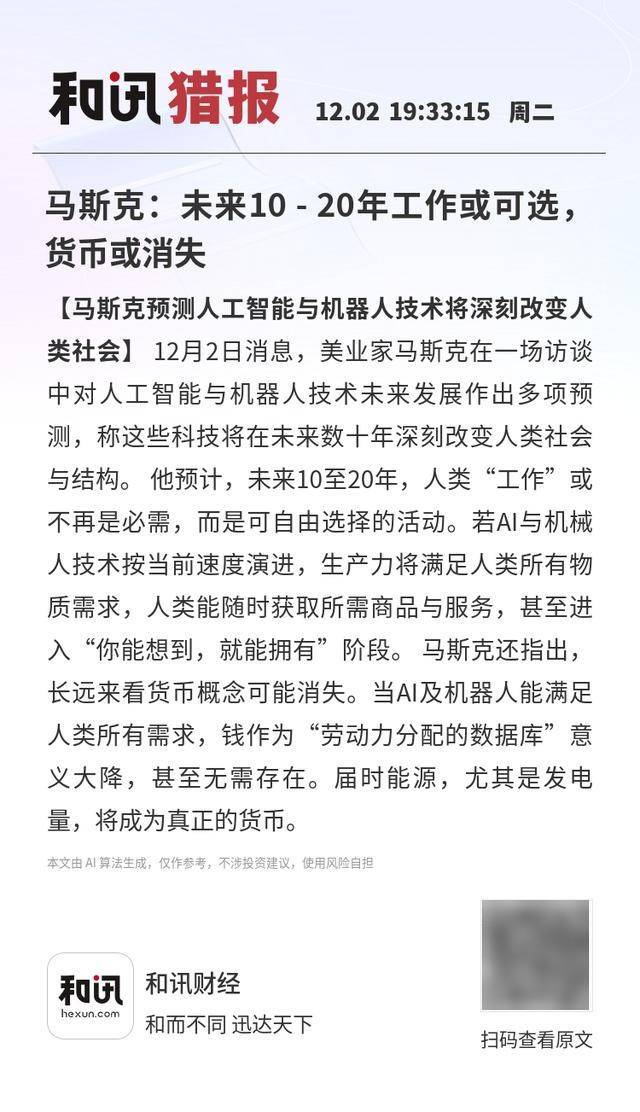 本文由 AI算法生成,仅作参考,不涉投资建议,使用风险自担 【马斯克预测人工智能与机器人技术将深刻改变人类社会】12月2日消息,美业家马斯克在一场访谈中 对人工智能与机器人技术未来发展作出多项预测,称这些科技将在未来数十年深刻改变人类社会与结 构。 他预计,未来10至20年,人类"工作"或不再是必需,而是可自由选择的活动。若AI与机械人技术 按当前速度演进,生产力将满足人类所有物质需求,人类能随时获取所需商品与服务,甚至进入"你能 想到,就能拥有"阶段。 马斯克还指出,长远来看货币概念可能消失。当AI及机器人能满足人类所有需 求,钱作为"劳动力分配的数据库"意义大降,甚至无需存在。届时能源,尤其是发电量,将成为真正的 货币。 本文由 Al 算法生成,仅作参考,不涉投资建议,使用风险自担 和讯财经 FUL hexun.con 和而不同 迅达天下 扫码查看原文 ...